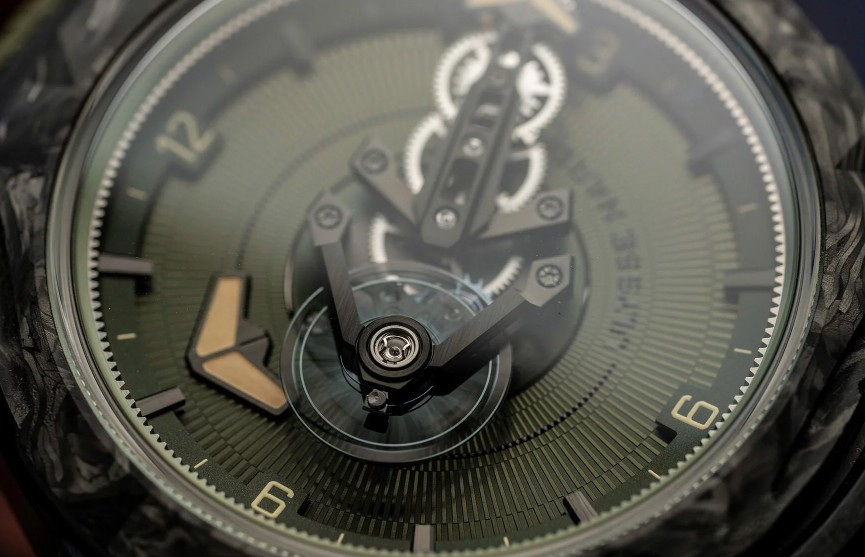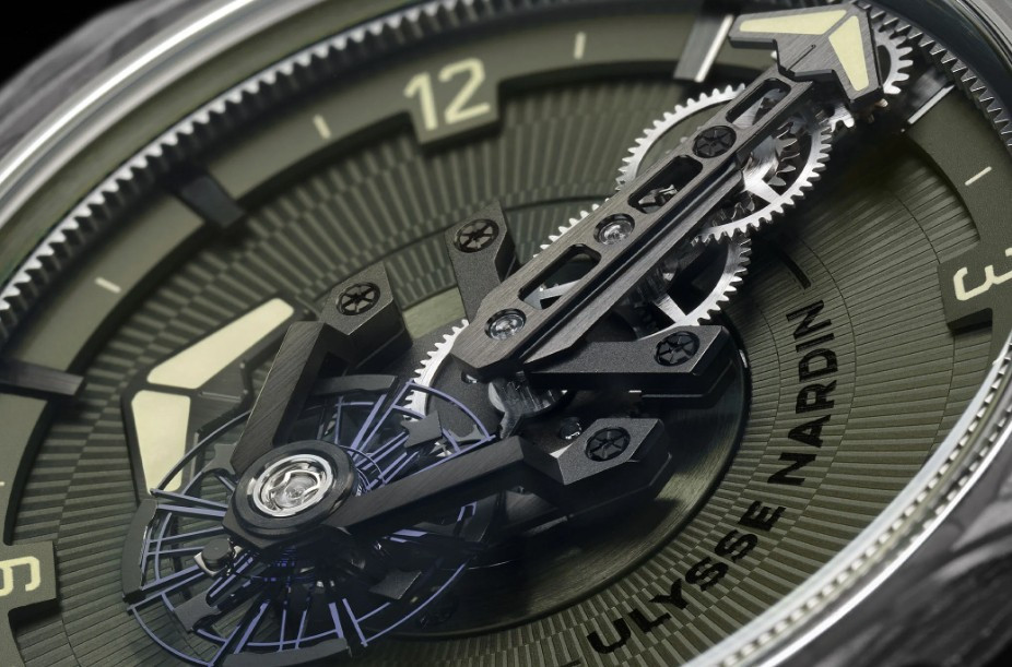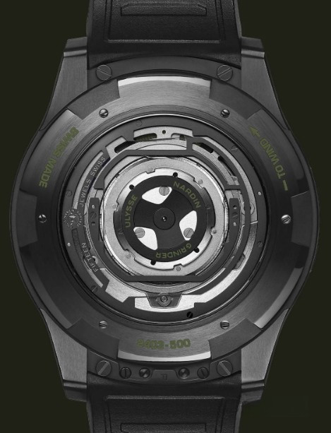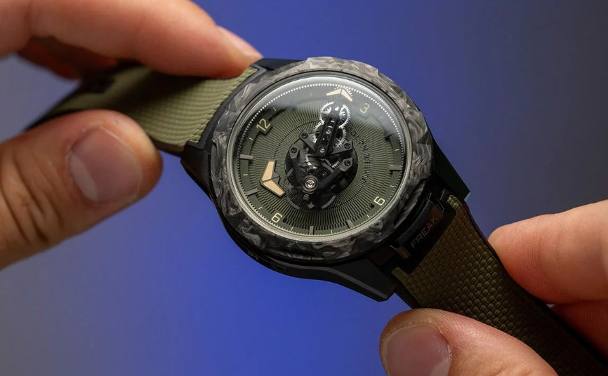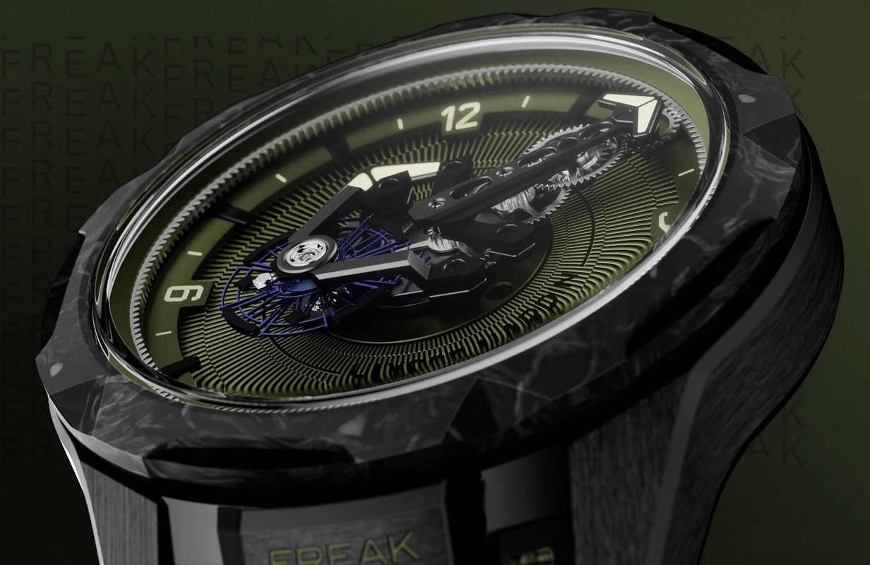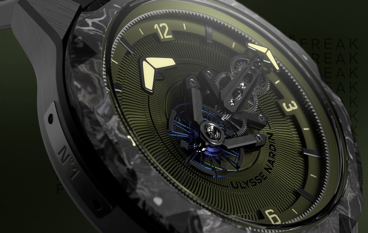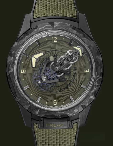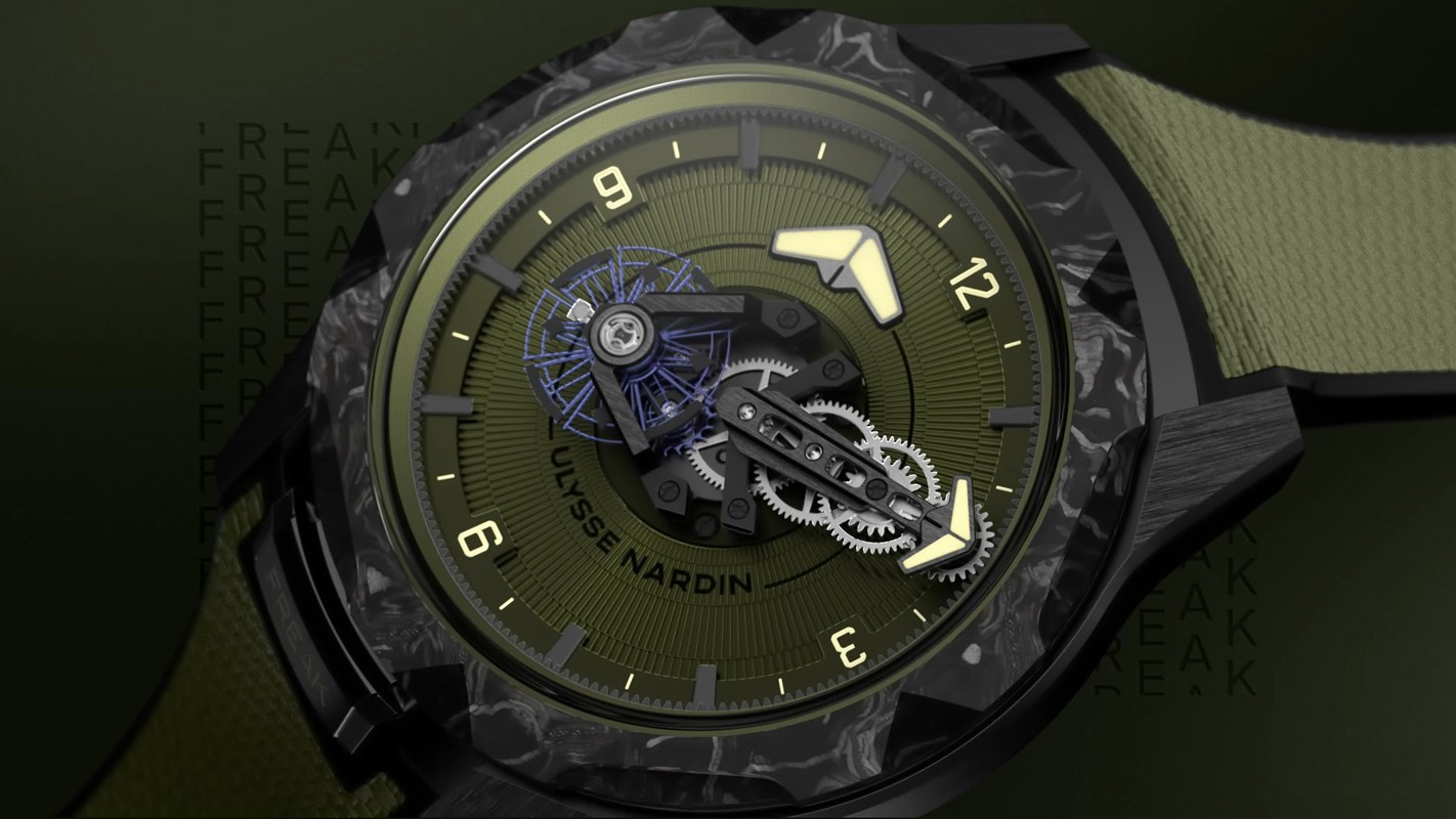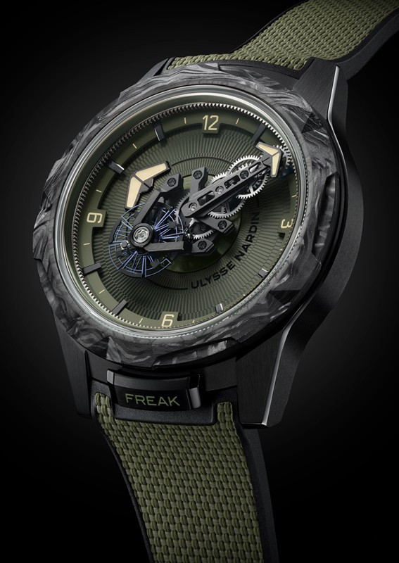 Часы Ulysse Nardin Freak One представлены в корпусе размером 44 х 12 мм из титана с покрытием DLC водонепроницаемостью 30 метров. Внутри корпуса установлен автоматический механизм, Калибр UN-240, обладающий запасом хода 72 часа. На циферблате цвета хаки отображаются часы, минуты. Часы поставляются на каучуковом ремешке с титановой застежкой.