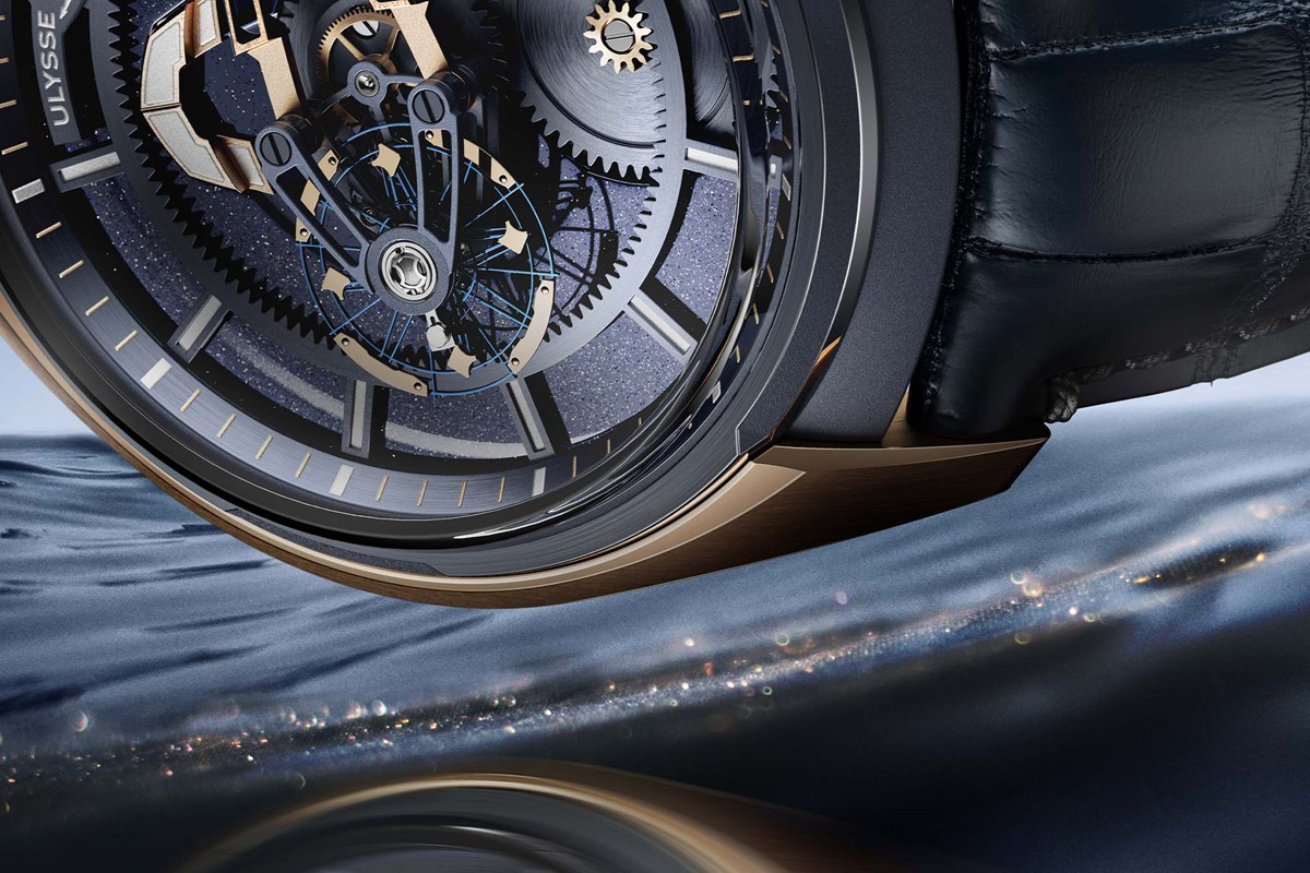 Часы Ulysse Nardin Freak X представлены в корпусе из титана и розового золота 18к размером 43 мм и водонепроницаемостью 50 м. Внутри корпуса установлен автоматический механизм, Калибр UN-230, обладающий запасом хода 72 часа. На синем циферблате отображаются часы, минуты. Часы комплектуются ремешком из кожи аллигатора с титановой застежкой. Серия ограничена - 99 шт.