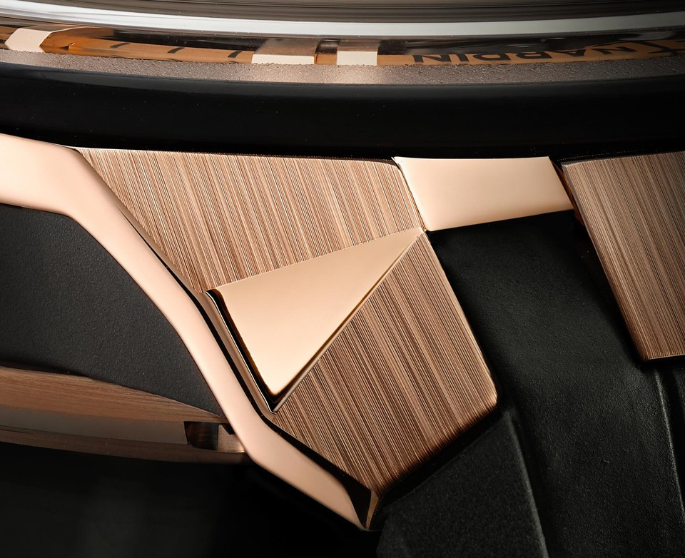 Часы Ulysse Nardin Blast HourStriker Tourbillon представлены в корпусе из розового золота 18к и титана с покрытием DLC размером 45 мм водонепроницаемостью 30 метров. Внутри корпуса находится автоматический механизм, Калибр UN-621, обладающий заасом хода 60 часов. На черном скелетированном циферблате отображаются часы, минуты, турбийон. Часы поставляются на ремешке из вельвета с вставкой из розового золота 18к.