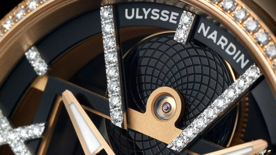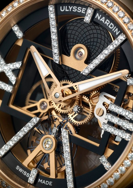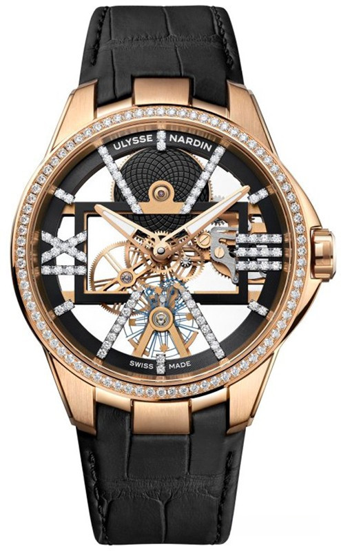 Корпус часов Skeleton X изготовлен из розового золота 18к. Динамичный дизайн - визитная карточка моделей Ulysse Nardin «X». «Икс» на циферблате образуется четырьмя индексами, опирающимися на прямоугольник, закрепленный римскими цифрами с каждой стороны. Ремешок из кожи аллигатора завершает образ. Размер корпуса Skeleton X составляет 42 мм. Механизм с ручным заводом имеет 4-дневный запас хода. Калибр UN-371 снабжен кремниевым балансировочным колесом и миниатюрной зубчатой передачей, обладает балансовой часто-той 3 Гц. Римскими цифрами обозначены три и девять часов, а указатель и стрелки покрыты белой Superluminova для чтения времени в темное время суток. Циферблат и корпус инкрустирован белыми бриллиантами.