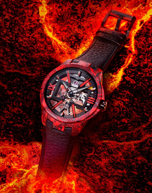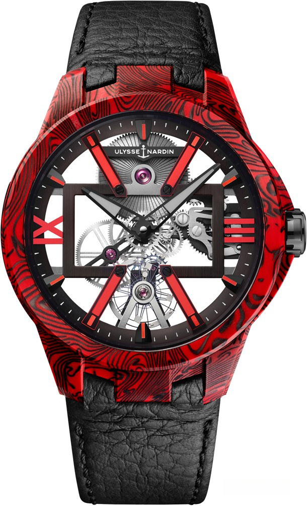 Изготовленный из ультралегкого углеродного волокна и красной мраморной эпоксидной смолы, каждый Skeleton X Magma уникален. Корпус часов получился сверхлегким, устойчивым к царапинам и обтекаемым. Динамичный дизайн - визитная карточка моделей Ulysse Nardin «X». «Икс» на циферблате образуется четырьмя индексами, опирающимися на прямоугольник, закрепленный римскими цифрами с каждой стороны. Сочетание красного и черного завораживает и заряжает энергией. Черный кожаный ремешок с черной строчкой завершает образ. Размер корпуса Skeleton X Magma составляет 43 мм. Механизм с ручным заводом имеет 4-дневный запас хода. Калибр UN-371 снабжен кремниевым балансировочным колесом и миниатюрной зубчатой передачей, обладает балансовой часто-той 3 Гц. Красными римскими цифрами обозначены три и девять часов, а указатель и стрелки покрыты красной Superluminova для чтение времени в темное время суток.