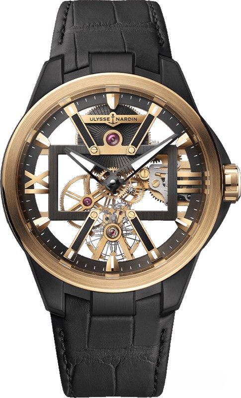 Корпус часов Skeleton X изготовлен из розового золота 18к и титана с покрытием DLC. Динамичный дизайн - визитная карточка моделей Ulysse Nardin «X». «Икс» на циферблате образуется четырьмя индексами, опирающимися на прямоугольник, закрепленный римскими цифрами с каждой стороны. Ремешок из кожи аллигатора завершает образ. Размер корпуса Skeleton X составляет 42 мм. Механизм с ручным заводом имеет 4-дневный запас хода. Калибр UN-371 снабжен кремниевым балансировочным колесом и миниатюрной зубчатой передачей, обладает балансовой часто-той 3 Гц. Римскими цифрами обозначены три и девять часов, а указатель и стрелки покрыты белой Superluminova для чтения времени в темное время суток.