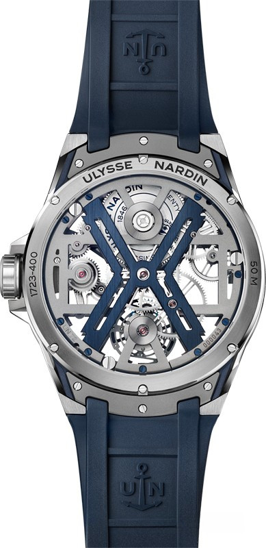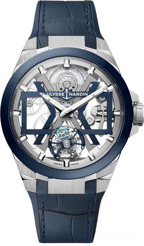 Часы Ulysse Nardin Blast Tourbillon Automatic 45 mm выпущены в корпусе из титана. Размер составляет 45 мм, водонепроницаемость 50 м. Внутри корпуса установлен автоматический механизм с турбийоном, Калибр UN-172, обладающий запасом хода 72 часа. На синем скелетированном циферблате отображаются часы, минуты. Часы комплектуются каучуковым ремешком с титановой вставкой.