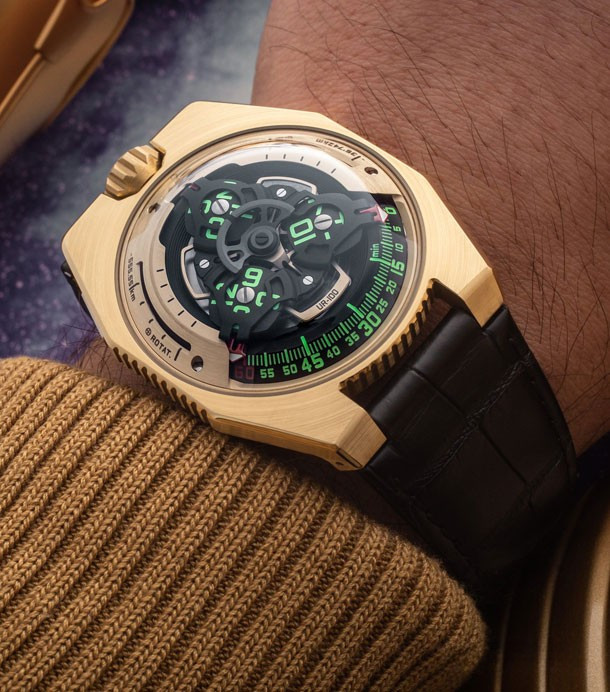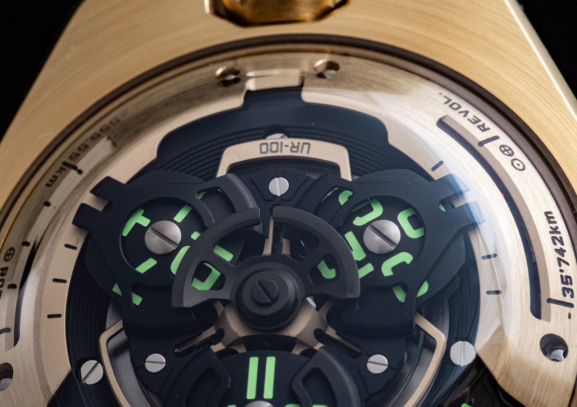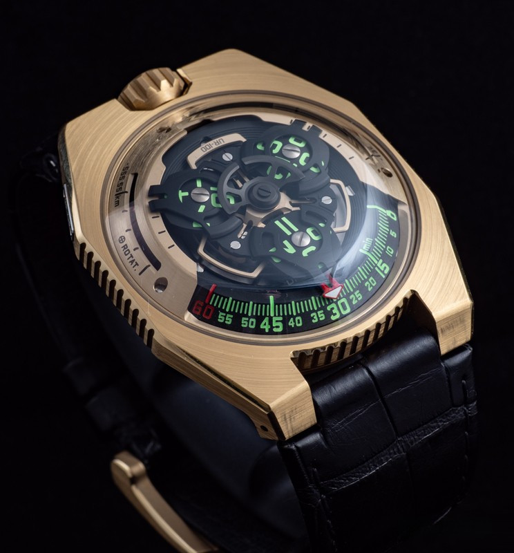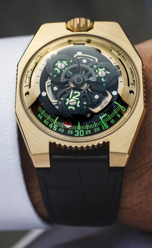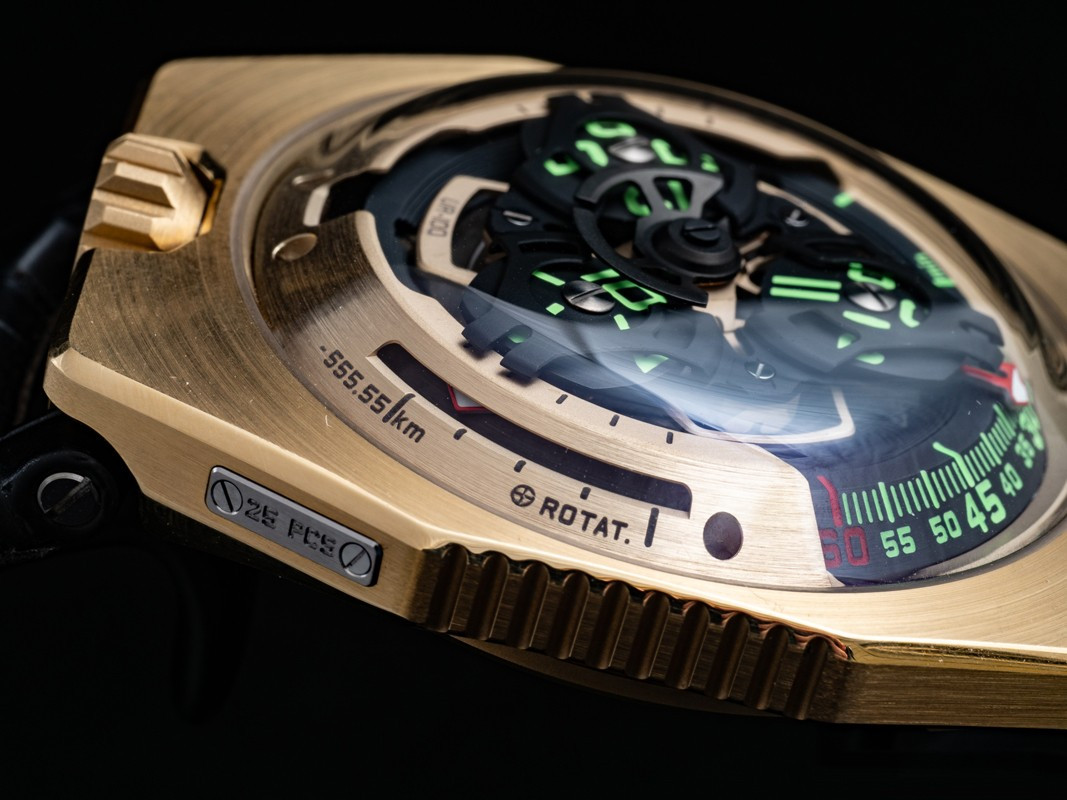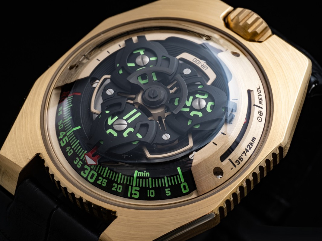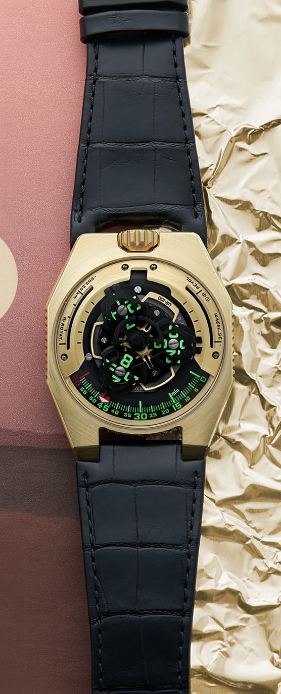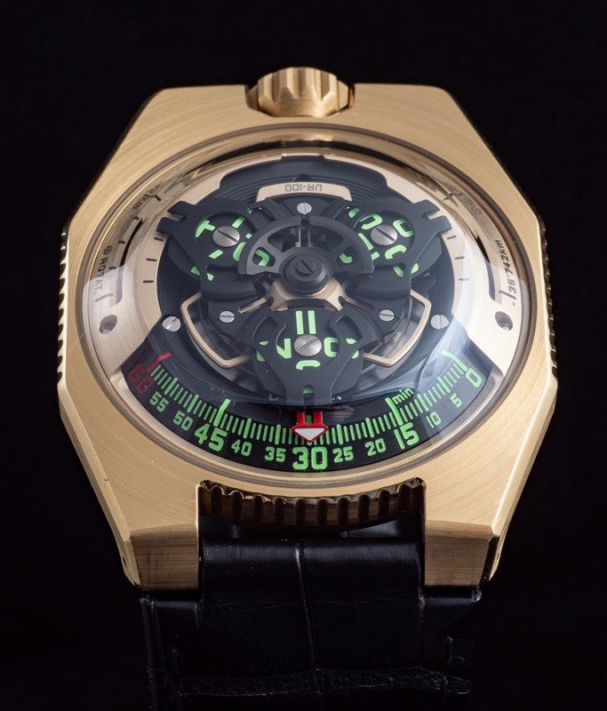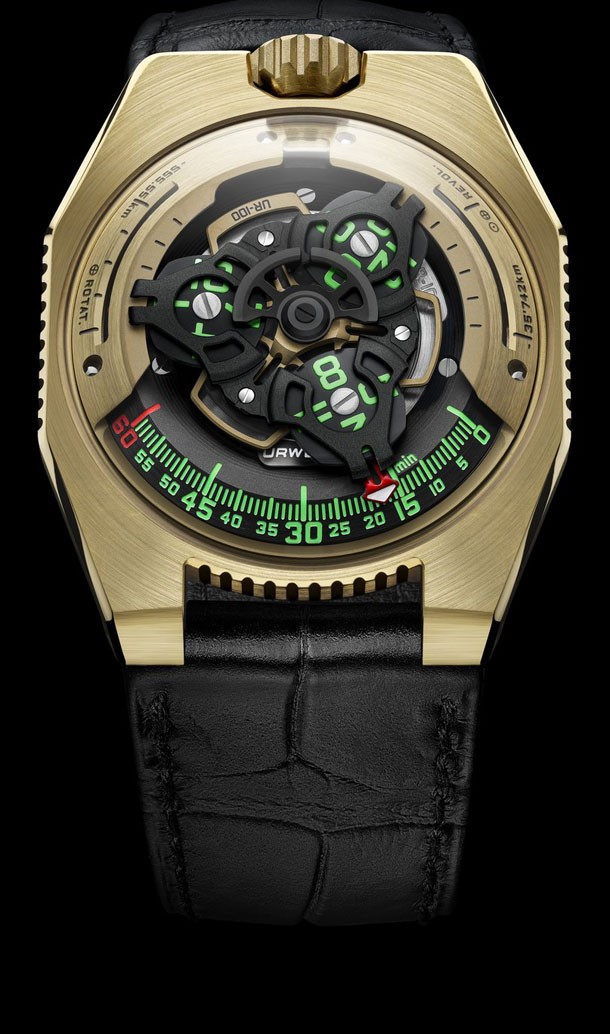Часы Urwerk UR-100 Gold Edition представлены в корпусе из желтого золота 18к размером 41 х 49.7 х 14 мм водонепроницаемостью 30 метров. Внутри корпуса установлен автоматический механзим, Калибр UR 12.01, обладающий запасом хода 48 часов. На черном скелетированном циферблате отображаются сателлитный час; минуты; расстояние, проходимое на Экваторе Земли за 20 минут, вращение Земли вокруг Солнца за 20 минут. Часы поставляются на ремешке из кожи аллигатора с вставкой из желтого золота 18к. Серия ограничена - 25 шт.