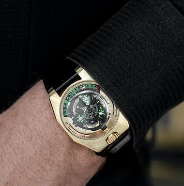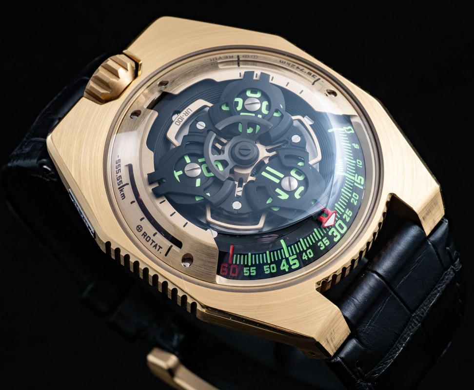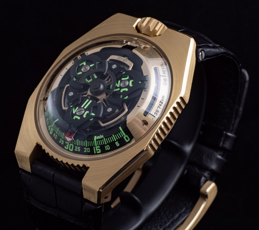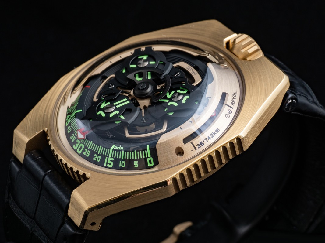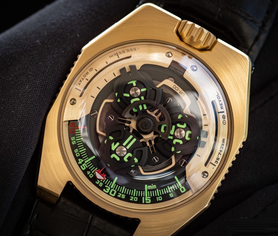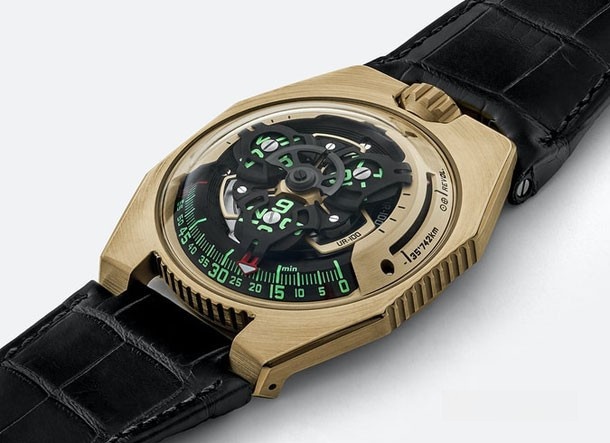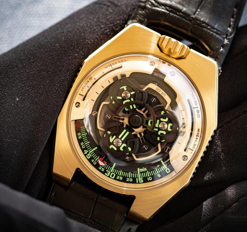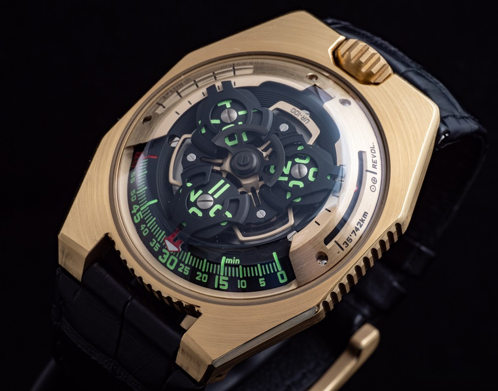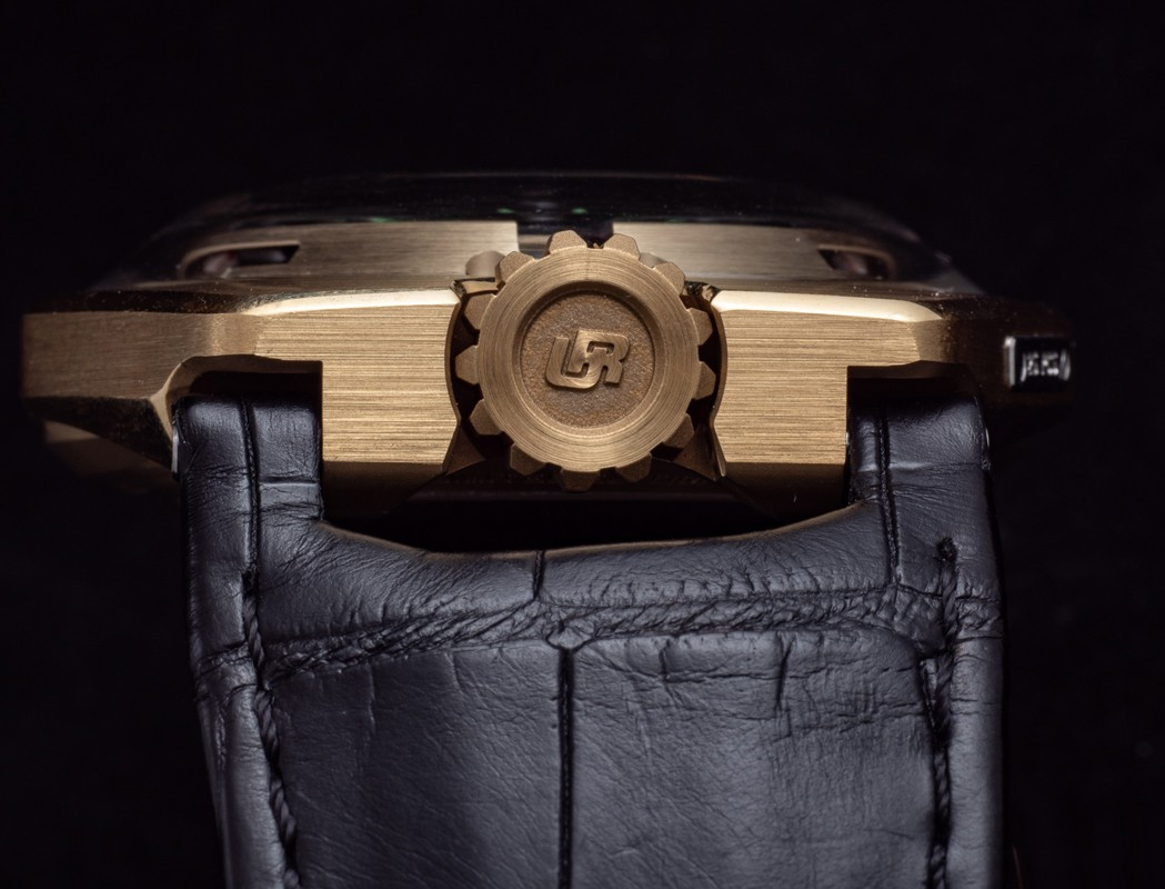 Часы Urwerk UR-100 Gold Edition представлены в корпусе из желтого золота 18к размером 41 х 49.7 х 14 мм водонепроницаемостью 30 метров. Внутри корпуса установлен автоматический механзим, Калибр UR 12.01, обладающий запасом хода 48 часов. На черном скелетированном циферблате отображаются сателлитный час; минуты; расстояние, проходимое на Экваторе Земли за 20 минут, вращение Земли вокруг Солнца за 20 минут. Часы поставляются на ремешке из кожи аллигатора с вставкой из желтого золота 18к. Серия ограничена - 25 шт.
