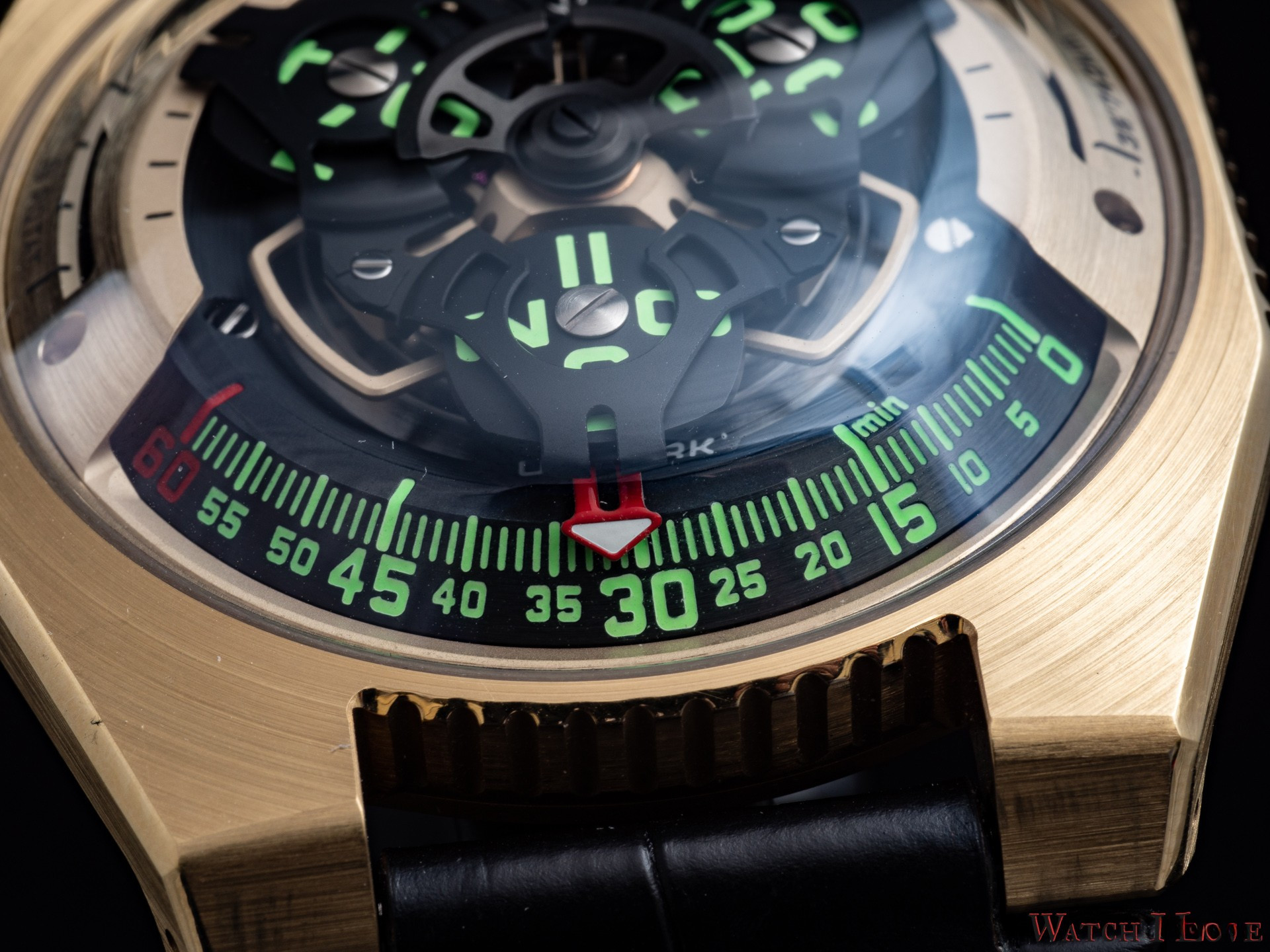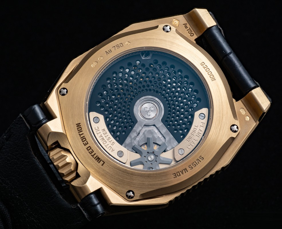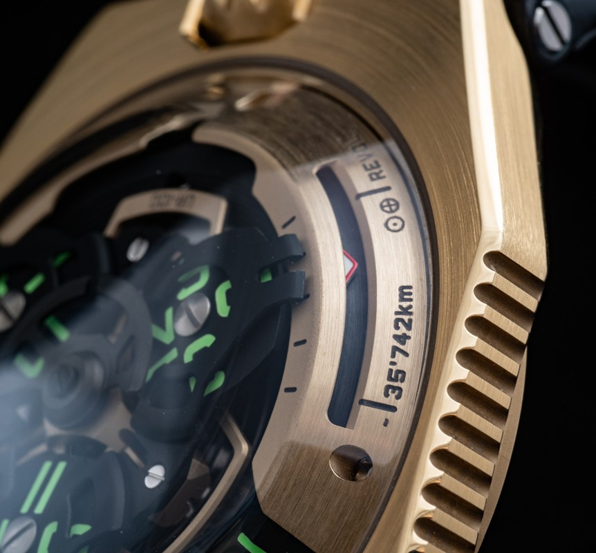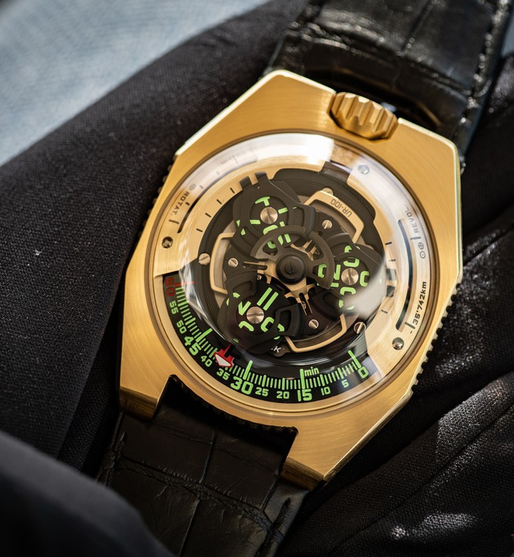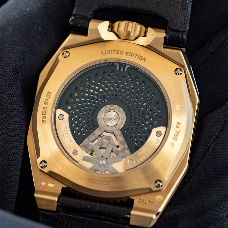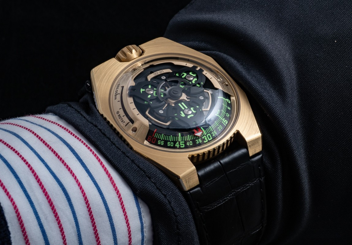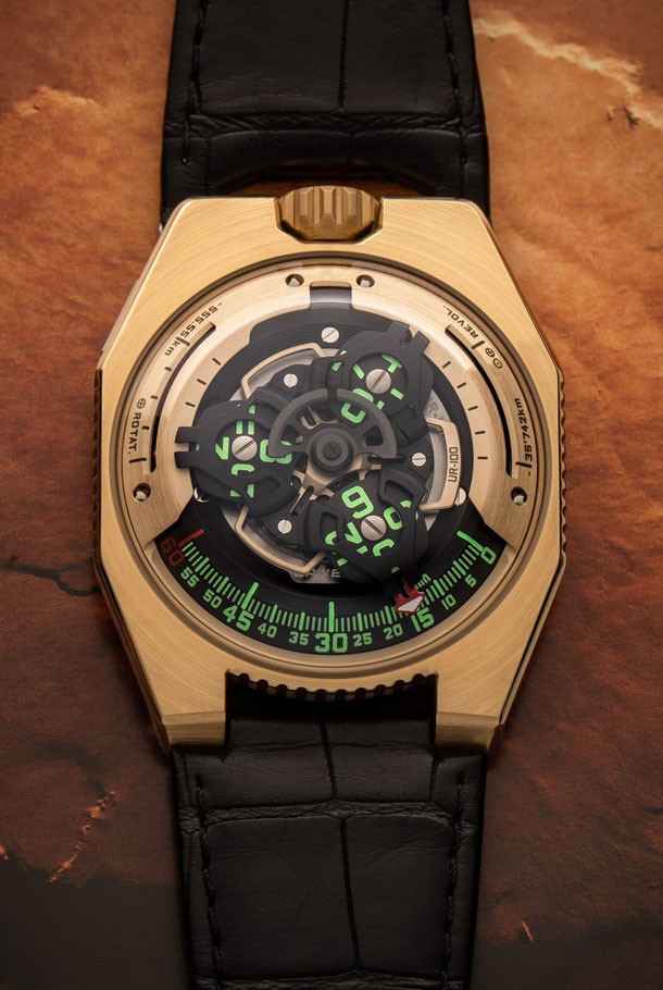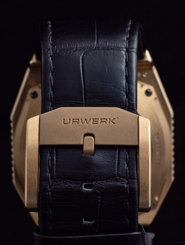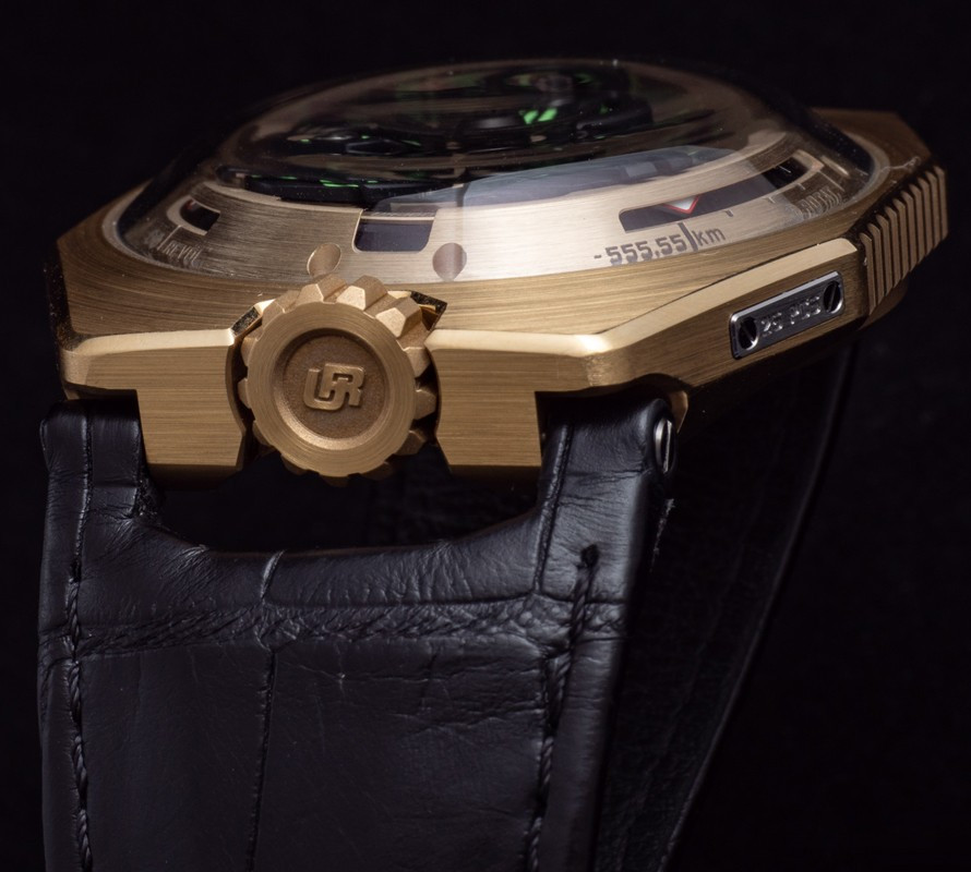 Часы Urwerk UR-100 Gold Edition представлены в корпусе из желтого золота 18к размером 41 х 49.7 х 14 мм водонепроницаемостью 30 метров. Внутри корпуса установлен автоматический механзим, Калибр UR 12.01, обладающий запасом хода 48 часов. На черном скелетированном циферблате отображаются сателлитный час; минуты; расстояние, проходимое на Экваторе Земли за 20 минут, вращение Земли вокруг Солнца за 20 минут. Часы поставляются на ремешке из кожи аллигатора с вставкой из желтого золота 18к. Серия ограничена - 25 шт.