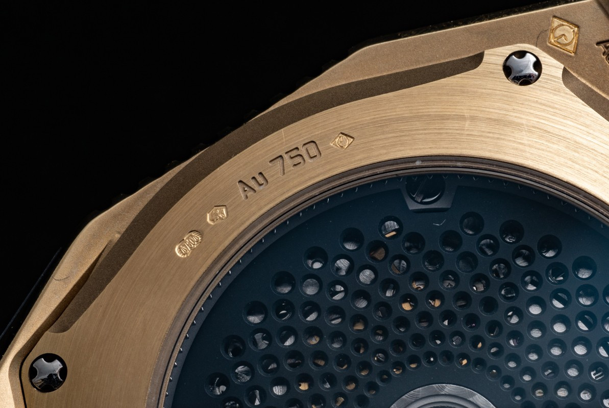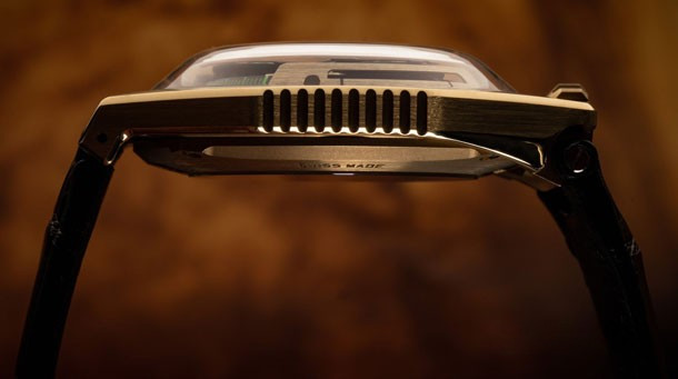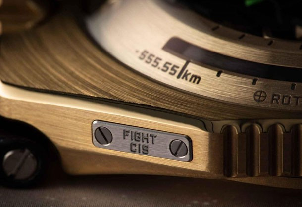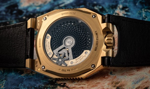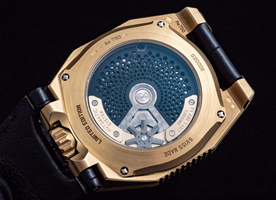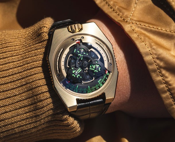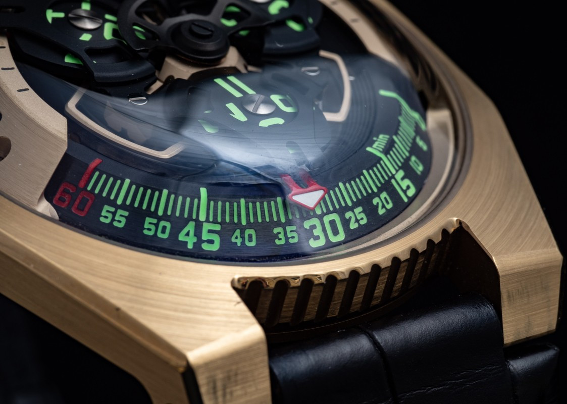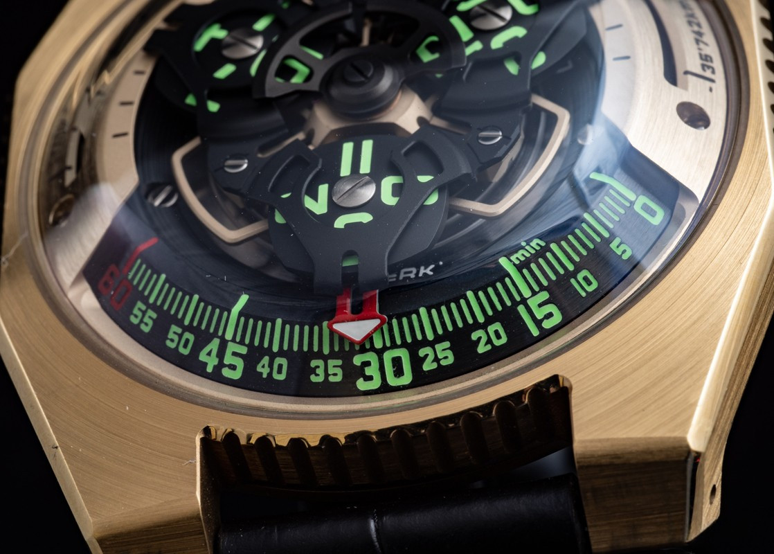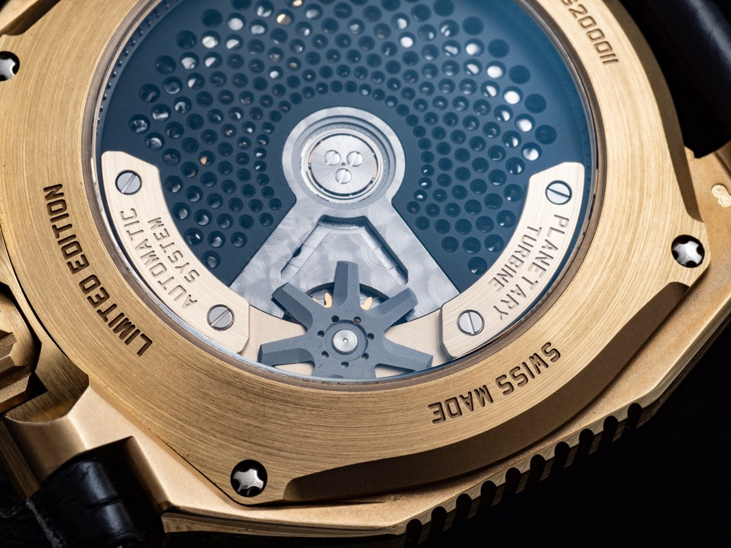 Часы Urwerk UR-100 Gold Edition представлены в корпусе из желтого золота 18к размером 41 х 49.7 х 14 мм водонепроницаемостью 30 метров. Внутри корпуса установлен автоматический механзим, Калибр UR 12.01, обладающий запасом хода 48 часов. На черном скелетированном циферблате отображаются сателлитный час; минуты; расстояние, проходимое на Экваторе Земли за 20 минут, вращение Земли вокруг Солнца за 20 минут. Часы поставляются на ремешке из кожи аллигатора с вставкой из желтого золота 18к. Серия ограничена - 25 шт.