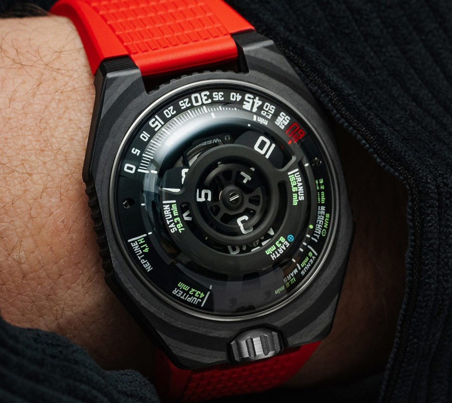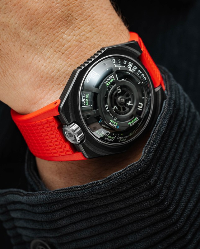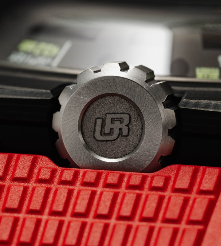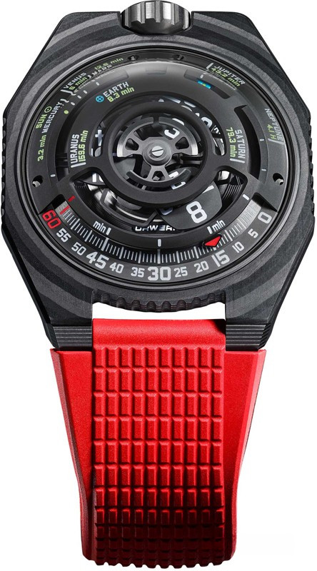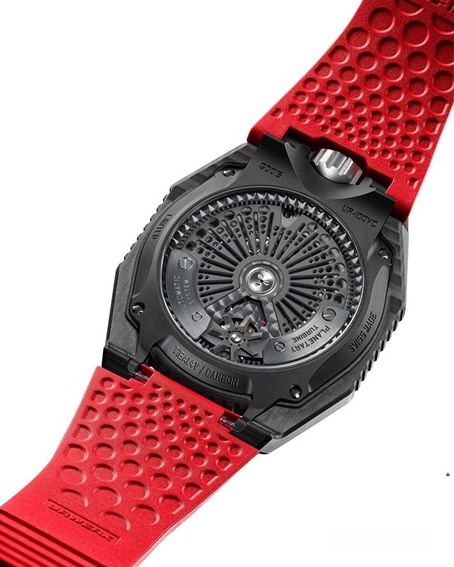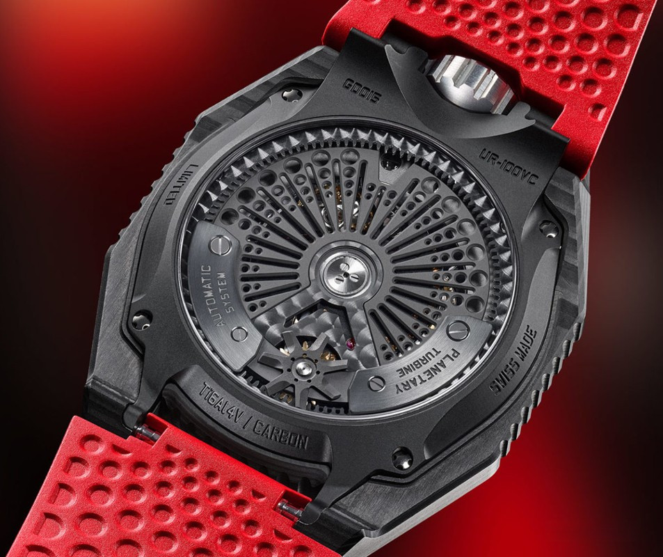 Часы Urwerk UR-100V представлены в корпусе из титана с покрытием DLC размером 41 х 49.7 х 14 мм водонепроницаемостью 30 метров. Внутри корпуса установлен автоматический механзим, Калибр UR 12.02, обладающий запасом хода 48 часов. На черном циферблате отображаются сателлитный час; минуты; расстояние, проходимое на Экваторе Земли за 20 минут, вращение Земли вокруг Солнца за 20 минут. Часы поставляются на кауучуковом ремешке с титановой застежкой.