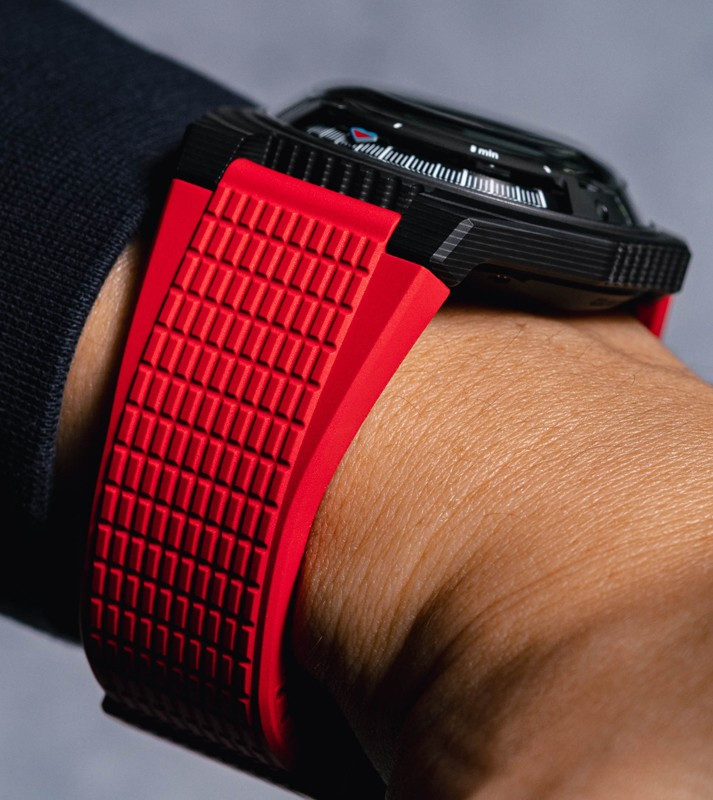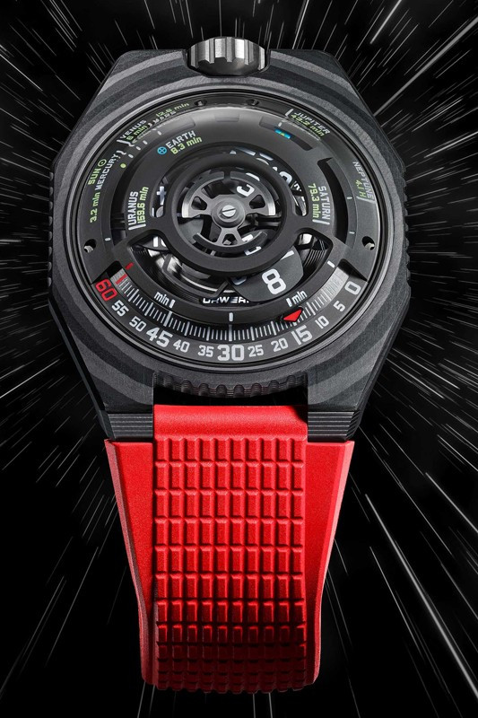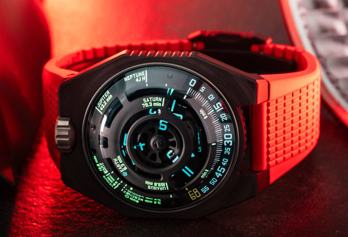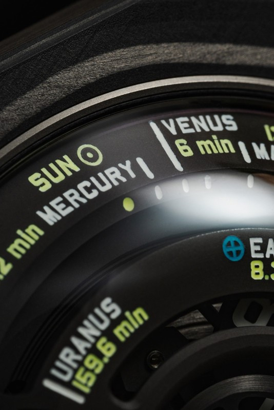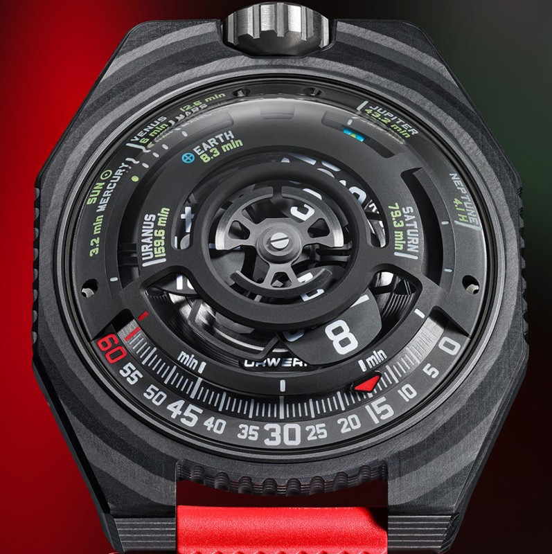 Часы Urwerk UR-100V представлены в корпусе из титана с покрытием DLC размером 41 х 49.7 х 14 мм водонепроницаемостью 30 метров. Внутри корпуса установлен автоматический механзим, Калибр UR 12.02, обладающий запасом хода 48 часов. На черном циферблате отображаются сателлитный час; минуты; расстояние, проходимое на Экваторе Земли за 20 минут, вращение Земли вокруг Солнца за 20 минут. Часы поставляются на кауучуковом ремешке с титановой застежкой.