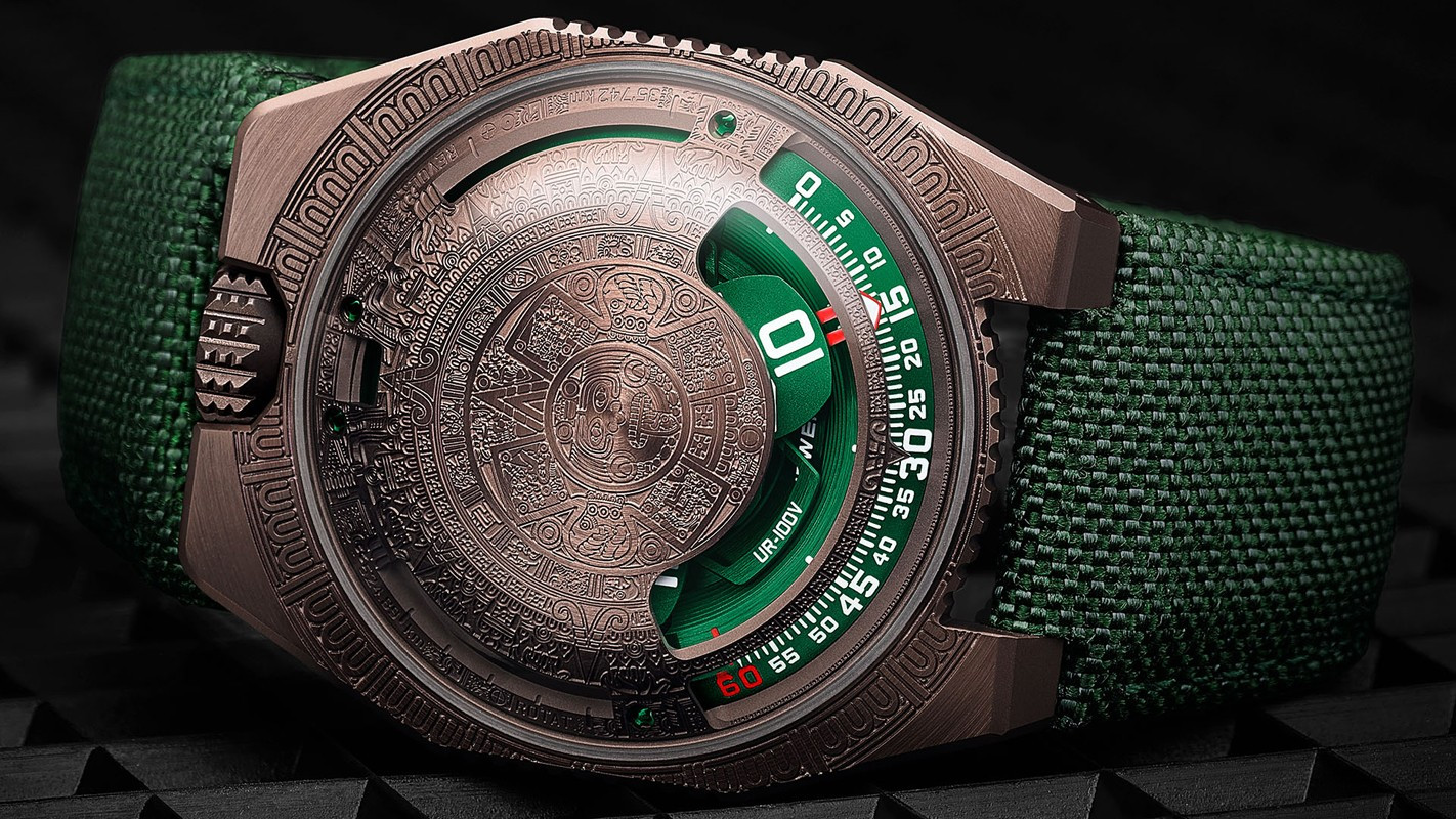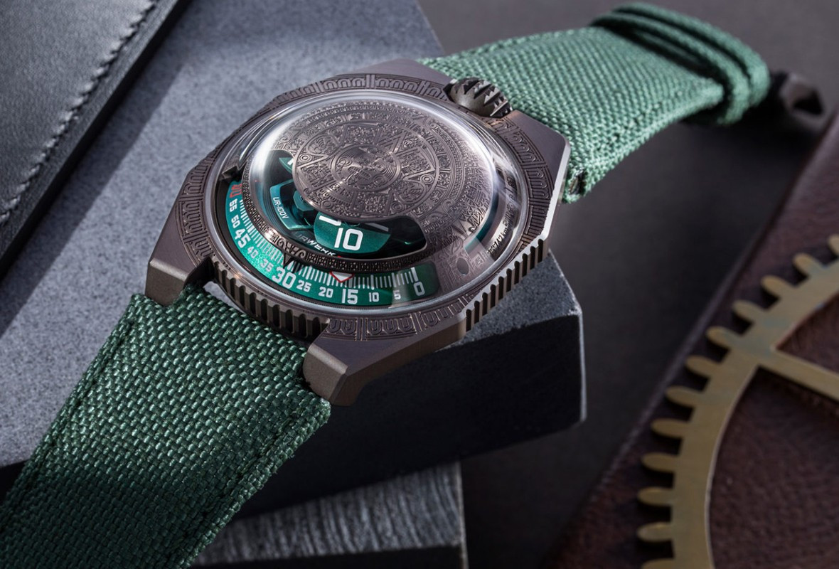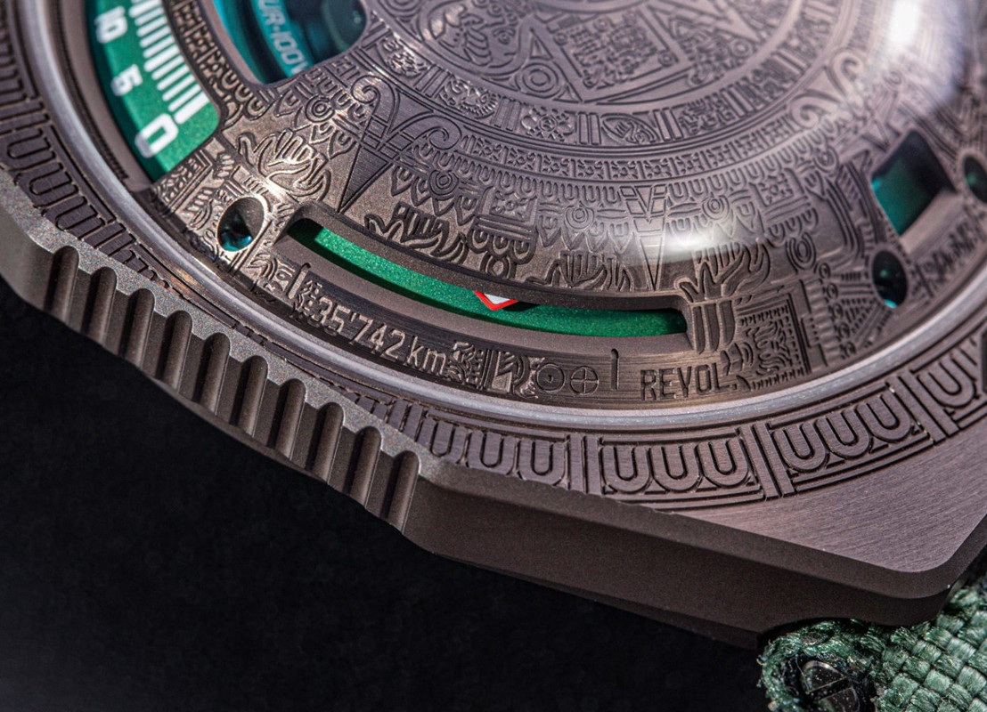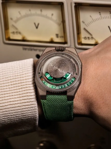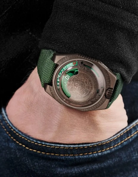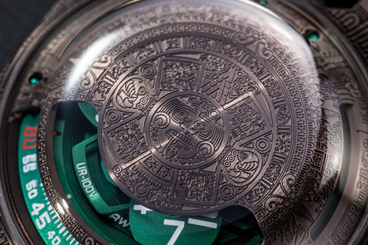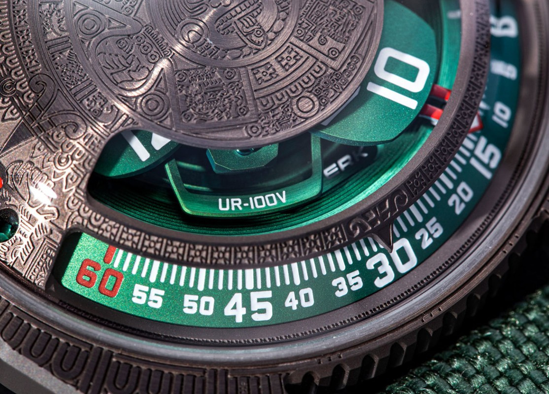 Часы Urwerk UR-100V представлены в корпусе из титана ии нержавеющей стали размером 41 х 49.7 х 14 мм водонепроницаемостью 30 метров. Внутри корпуса установлен автоматический механзим, Калибр UR 12.01, обладающий запасом хода 48 часов. На зеленом скелетированном циферблате отображаются сателлитный час; минуты; расстояние, проходимое на Экваторе Земли за 20 минут, вращение Земли вокруг Солнца за 20 минут. Часы поставляются на текстильном ремешке. Серия ограничена - 20 шт.