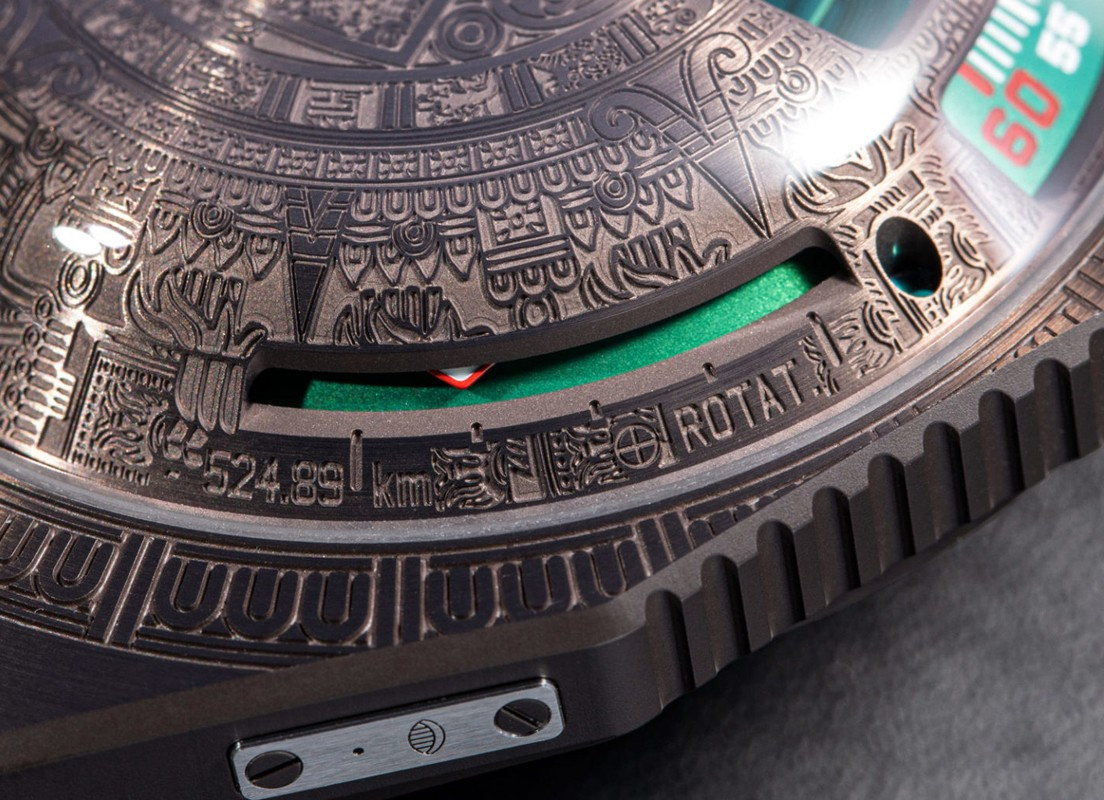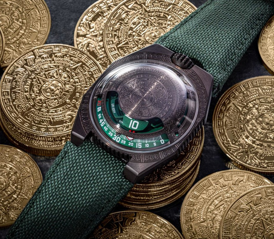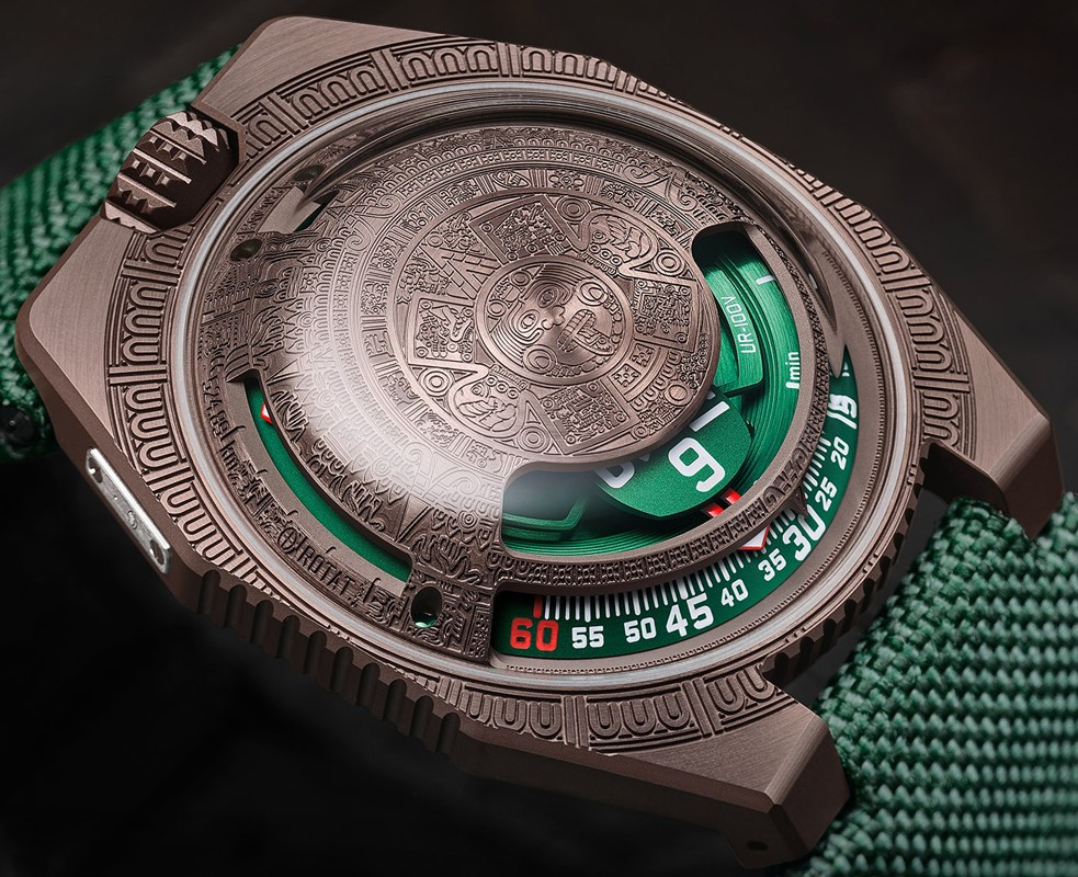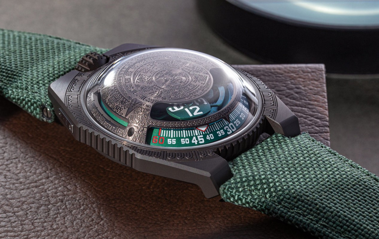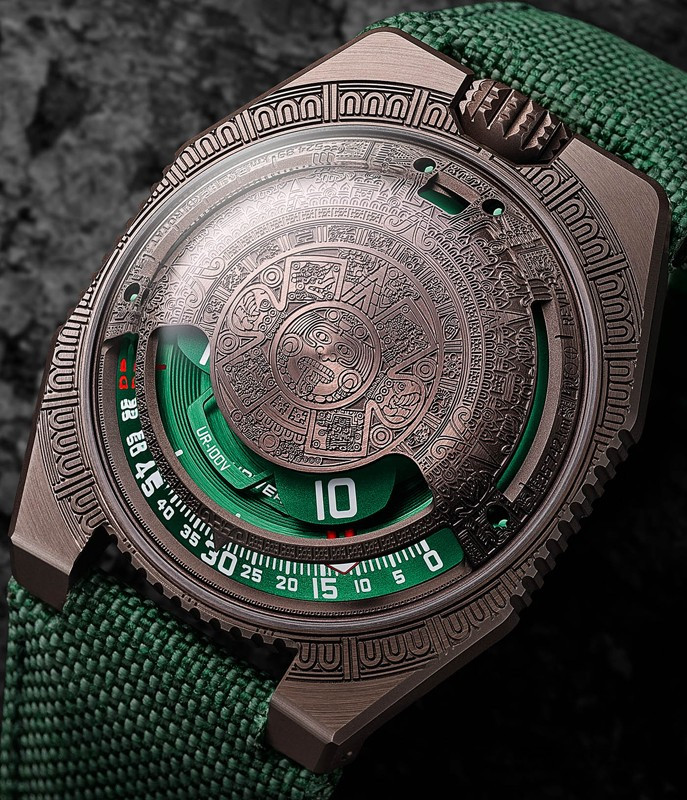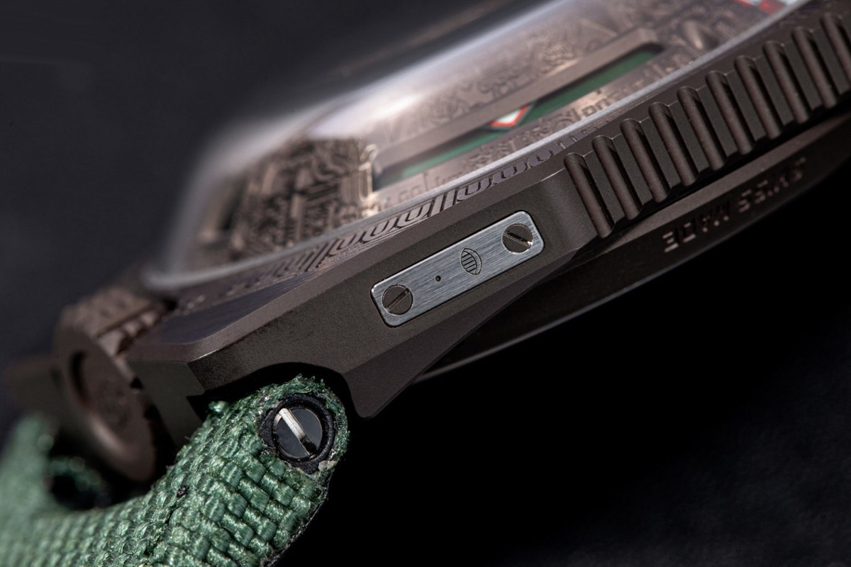 Часы Urwerk UR-100V представлены в корпусе из титана ии нержавеющей стали размером 41 х 49.7 х 14 мм водонепроницаемостью 30 метров. Внутри корпуса установлен автоматический механзим, Калибр UR 12.01, обладающий запасом хода 48 часов. На зеленом скелетированном циферблате отображаются сателлитный час; минуты; расстояние, проходимое на Экваторе Земли за 20 минут, вращение Земли вокруг Солнца за 20 минут. Часы поставляются на текстильном ремешке. Серия ограничена - 20 шт.