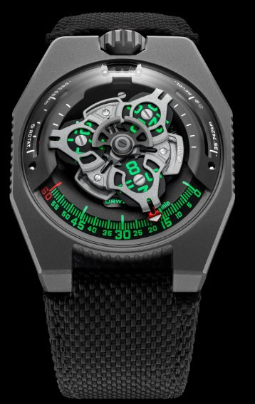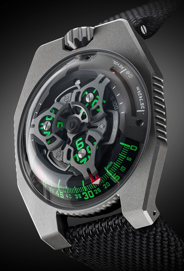 Часы Urwerk UR-100 GunMetal представлены в корпусе из титана и нержавеющей стали с покрытием PVD размером 41 х 49.7 х 14 мм водонепроницаемостью 30 метров. Внутри корпуса установлен автоматический механзим, Калибр UR 12.01, обладающий запасом хода 48 часов. На сером скелетированном циферблате отображаются сателлитный час; минуты; расстояние, проходимое на Экваторе Земли за 20 минут, вращение Земли вокруг Солнца за 20 минут. Часы поставляются на текстильном ремешке с вставкой из нержавеющей стали. Серия ограничена - 25 шт.