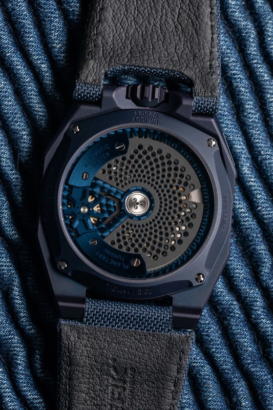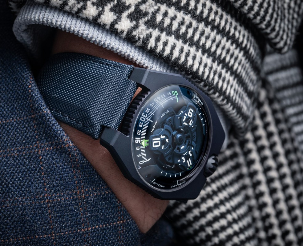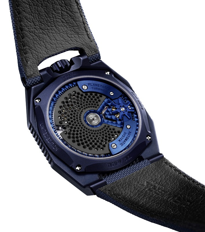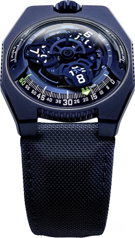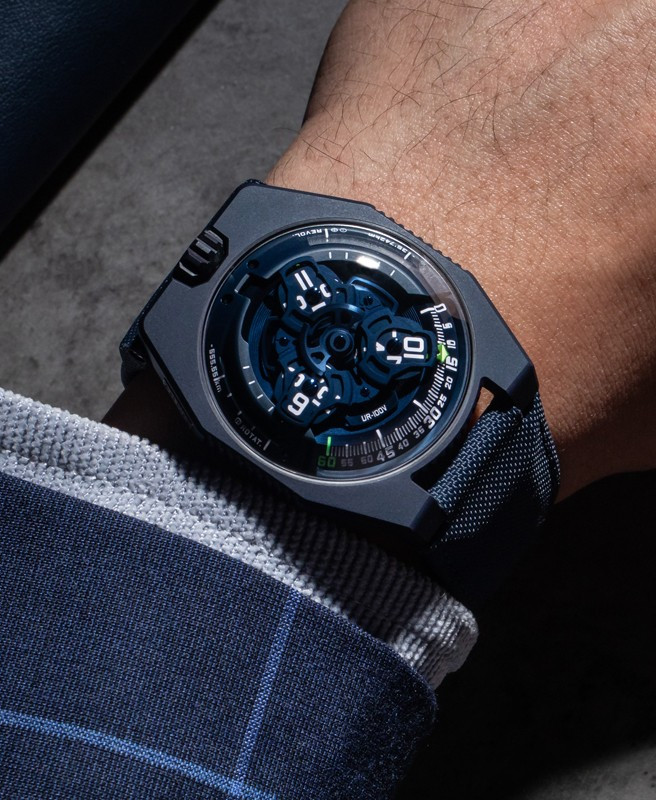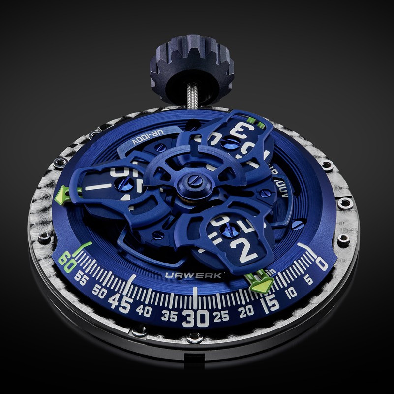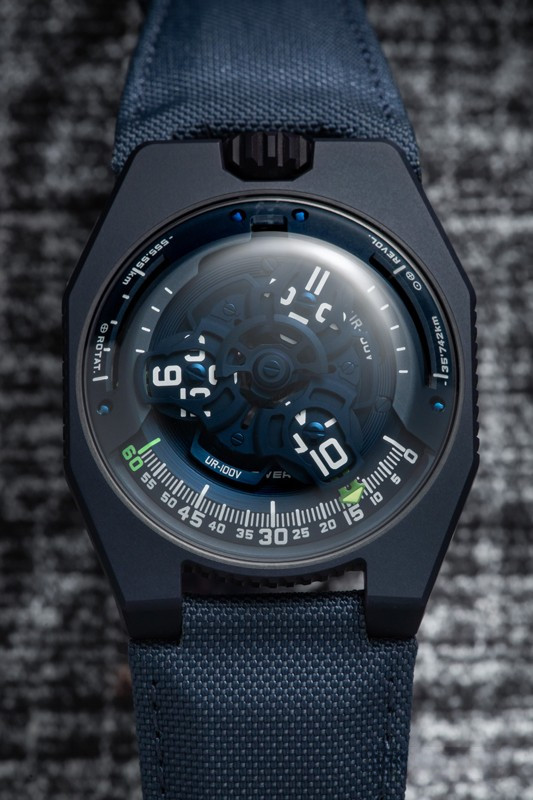 Часы Urwerk UR-100V Blue представлены в корпусе из нержавеющей стали с покрытием PVD и титана размером 41 х 49.7 х 14 мм водонепроницаемостью 30 метров. Внутри корпуса установлен автоматический механзим, Калибр UR 12.02, обладающий запасом хода 48 часов. На синем скелетированном циферблате отображаются сателлитный час; минуты; расстояние, проходимое на Экваторе Земли за 20 минут, вращение Земли вокруг Солнца за 20 минут. Часы поставляются на текстильном ремешке с вставкой из нержавеющей стали. Серия ограничена - 25 шт.