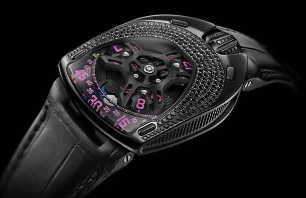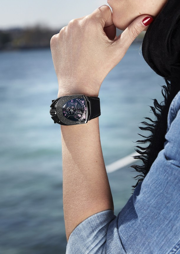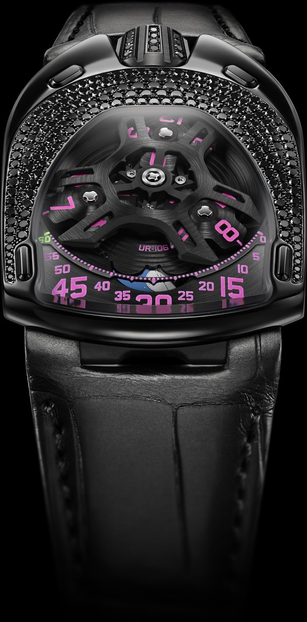 UR-106 – первая модель этого независимого часового бренда, посвященная женщине. UR-106 Black Pink Lotus предлагает по-новому взглянуть на неизменный символ бренда – сателлитный указатель с тремя дисками, выступающими на поверхности циферблата, как лепестки фантастического цветка. Модель представлена из титана и стали с черным PVD-покрытием и инкрустацией черными бриллиантами. UR-106 Black Pink Lotus оснащен новой модификацией сателлитного указателя времени. Три диска, на каждом из которых нанесено по четыре часовых деления, проплывают один за другим перед минутной шкалой. Индикация времени – аналоговая и цифровая. Дополнительное устройство – указатель фаз Луны.