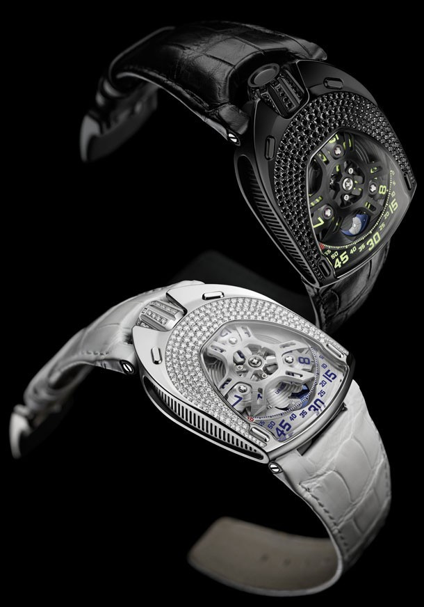 UR-106 – первая модель этого независимого часового бренда, посвященная женщине. UR-106 «Lotus» предлагает по-новому взглянуть на неизменный символ бренда – сателлитный указатель с тремя дисками, выступающими на поверхности циферблата, как лепестки фантастического цветка. Модель представлена из титана и стали с черным PVD-покрытием и инкрустацией черными бриллиантами. UR-106 «Lotus» оснащен новой модификацией сателлитного указателя времени. Три диска, на каждом из которых нанесено по четыре часовых деления, проплывают один за другим перед минутной шкалой. Индикация времени – аналоговая и цифровая. Дополнительное устройство – указатель фаз Луны.