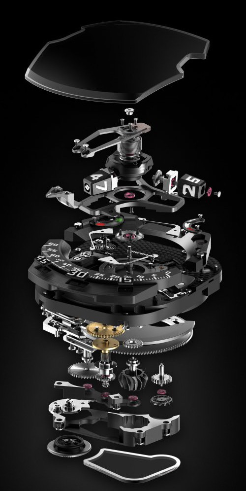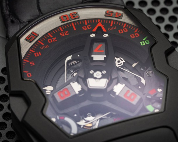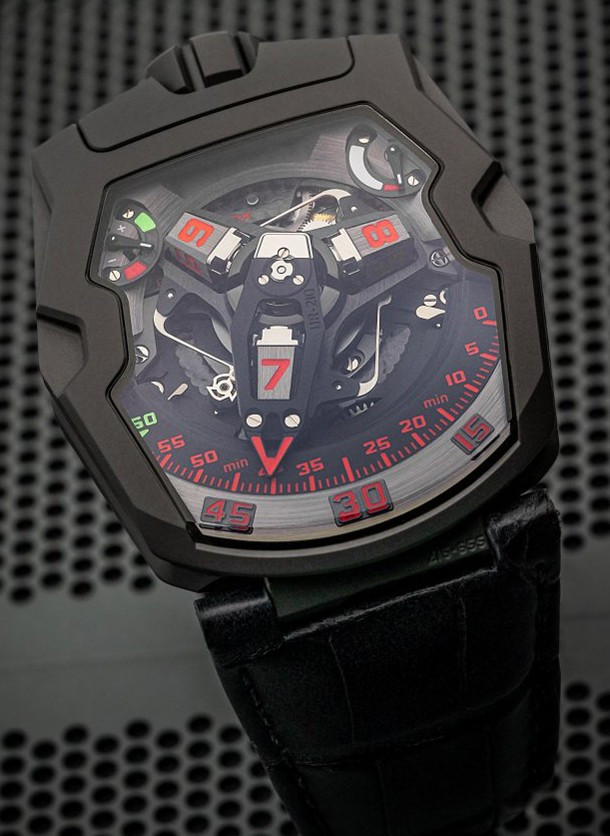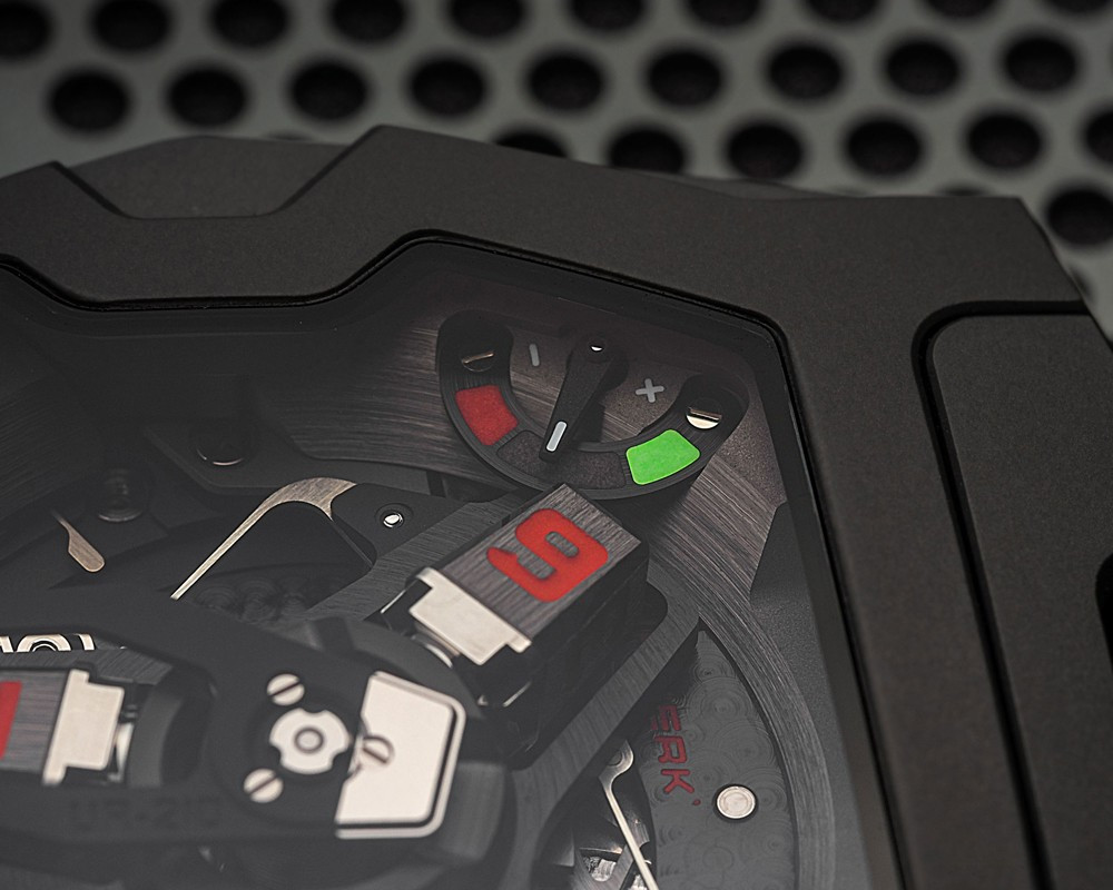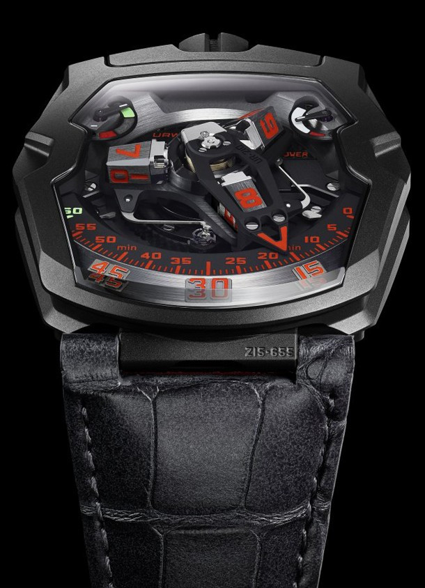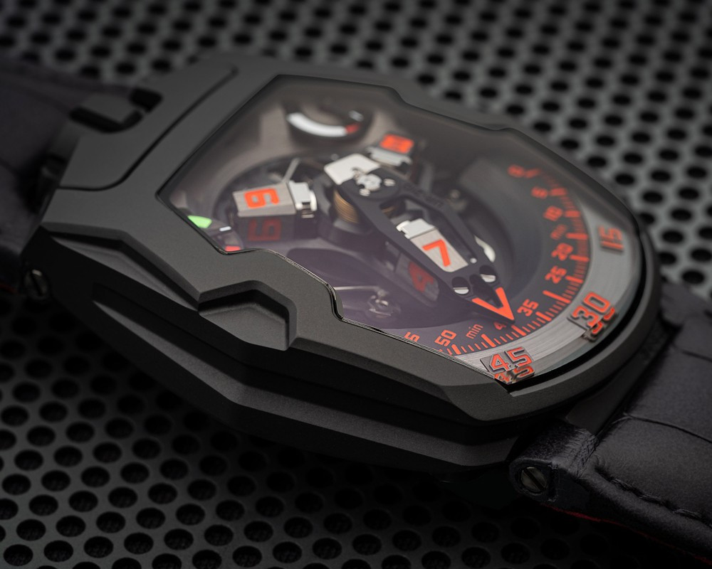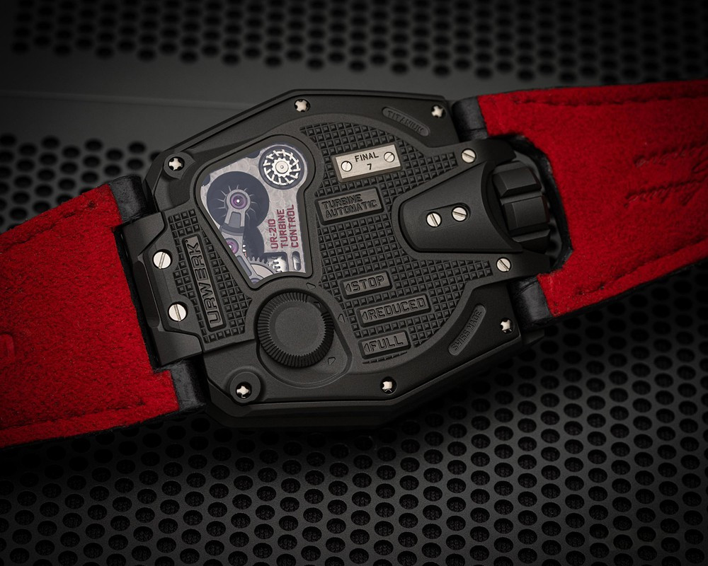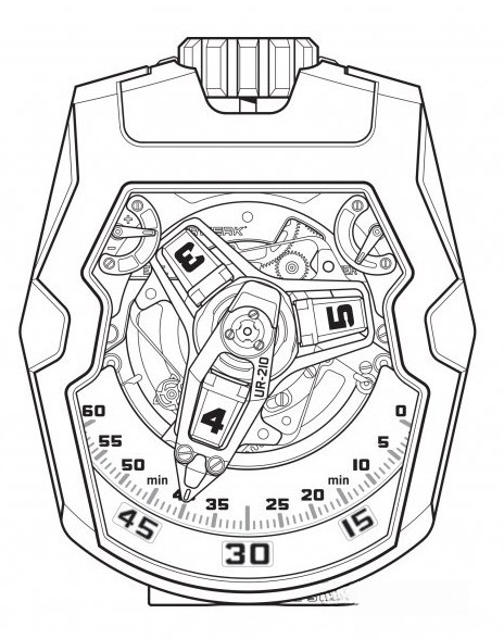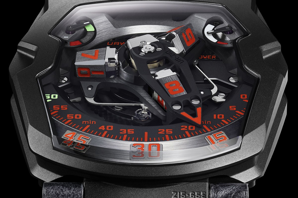 Впервые модель UR-210 была выпущена в 2012 году, ее циферблат заслужил особое внимание в мире часового искусства. Трехлучевая четырехсторонняя минутная стрелка выполняет роль базы с индикатором часа в то время как сама передвигается вдоль минутной шкалы. Архитектуру сиситемы можно наблюдать сквозь прозрачное сапфировое стекло. Но самой главной отличительной чертой UR-210 является индикатор завода, отображающий остаток энергии. Подзавод механизма осуществляется быстрее, чем энергия расходуется? Или ваш образ жизни недостаточно активен для завода механизма? Обладая этими данными, владелец может установить более чувствительный режим, при котором даже малейшее движение рукой будет использоваться рационально. Переключатель режима находится на задней стороне корпуса. Автоматический завод часов может быть и вовсе отключен, тогда часы превратятся в аксессуар с ручным заводом. Urwerk UR-210 Final имеет те же технические данные, что и другие модели UR-210. Однако ее привлекательный дизайн в черно-оранжевой палитре подчеркивает красоту классики Urwerk.