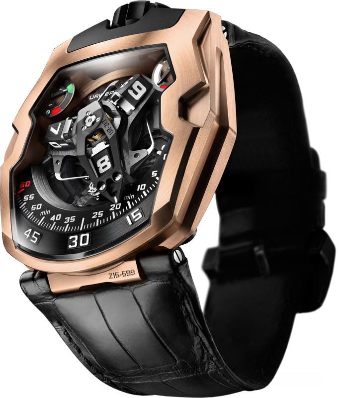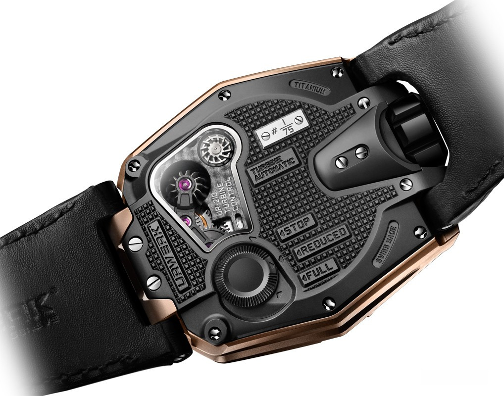 Модель Urwerk UR-210 RG наконец-то делает зримой ту особую связь, что рождается между человеком и его механическими часами. Циферблат UR-210 RG отличает классическая индикация запаса хода в положении «1 час». В противоположной части циферблата, в положении «11 часов», появляется практически такой же индикатор. За этим устройством скрывается не виданная ранее, впервые демонстрируемая разработка, определяющая эффективность завода механизма в течение двух последних часов ношения UR-210 RG. Если UR-210 RG показывают, что подача энергии недостаточна, следует установить регулятор подзавода (расположенный на обратной стороне часов) на отметку «полный режим». И тогда ротор преобразует любое мало-мальское движение руки в чистую энергию. При подобной настройке механизм подзавода оптимизирован благодаря турбине, соединенной с инерционным грузом и обеспечивающей соответствующий и бесперебойный завод часов. Если подзавод работает слишком интенсивно и создает излишнюю нагрузку для механизма, нужно перевести регулировочное колесико на отметку «облегченный режим», и включится устройство по ограничению вращения ротора. Заработает закрепленная на рубинах лопастная турбина, которая – наподобие воздушного компрессора – создаст сопротивление, трение воздуха, достаточное для замедления автоматического подзавода с помощью инерционного груза. В режиме «стоп» устройство автоматического подзавода отключено, и UR-210 RG превращаются в часы с обычным ручным заводом.