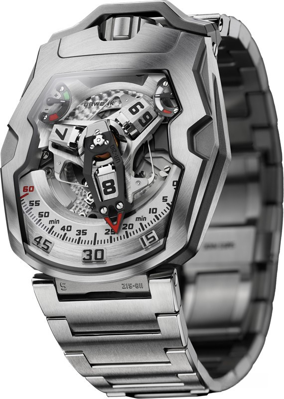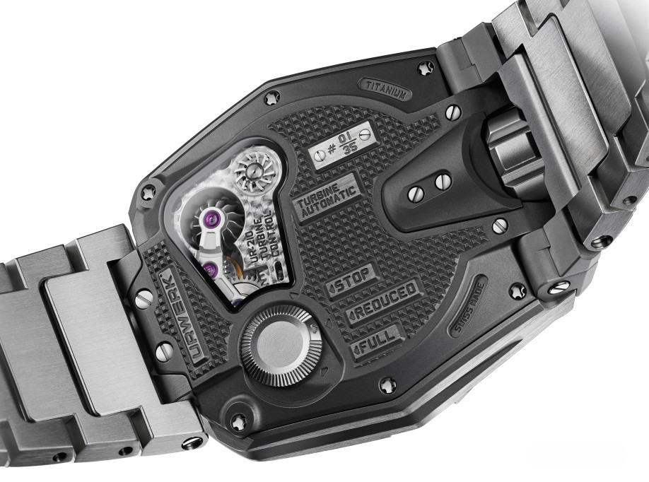 Модель Urwerk UR-210S наконец-то делает зримой ту особую связь, что рождается между человеком и его механическими часами. Циферблат UR-210S отличает классическая индикация запаса хода в положении «1 час». В противоположной части циферблата, в положении «11 часов», появляется практически такой же индикатор. За этим устройством скрывается не виданная ранее, впервые демонстрируемая разработка, определяющая эффективность завода механизма в течение двух последних часов ношения UR-210S. Если UR-210S показывают, что подача энергии недостаточна, следует установить регулятор подзавода (расположенный на обратной стороне часов) на отметку «полный режим». И тогда ротор преобразует любое мало-мальское движение руки в чистую энергию. При подобной настройке механизм подзавода оптимизирован благодаря турбине, соединенной с инерционным грузом и обеспечивающей соответствующий и бесперебойный завод часов. Если подзавод работает слишком интенсивно и создает излишнюю нагрузку для механизма, нужно перевести регулировочное колесико на отметку «облегченный режим», и включится устройство по ограничению вращения ротора. Заработает закрепленная на рубинах лопастная турбина, которая – наподобие воздушного компрессора – создаст сопротивление, трение воздуха, достаточное для замедления автоматического подзавода с помощью инерционного груза. В режиме «стоп» устройство автоматического подзавода отключено, и UR-210S превращаются в часы с обычным ручным заводом.