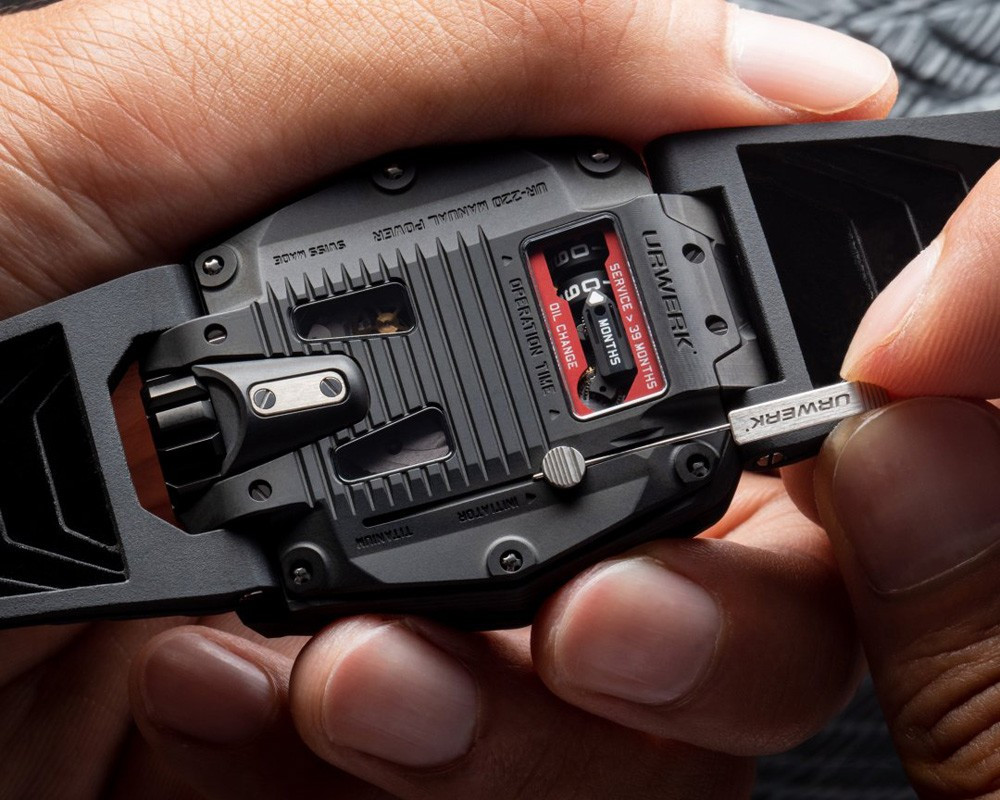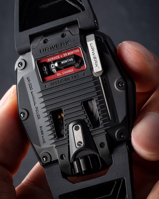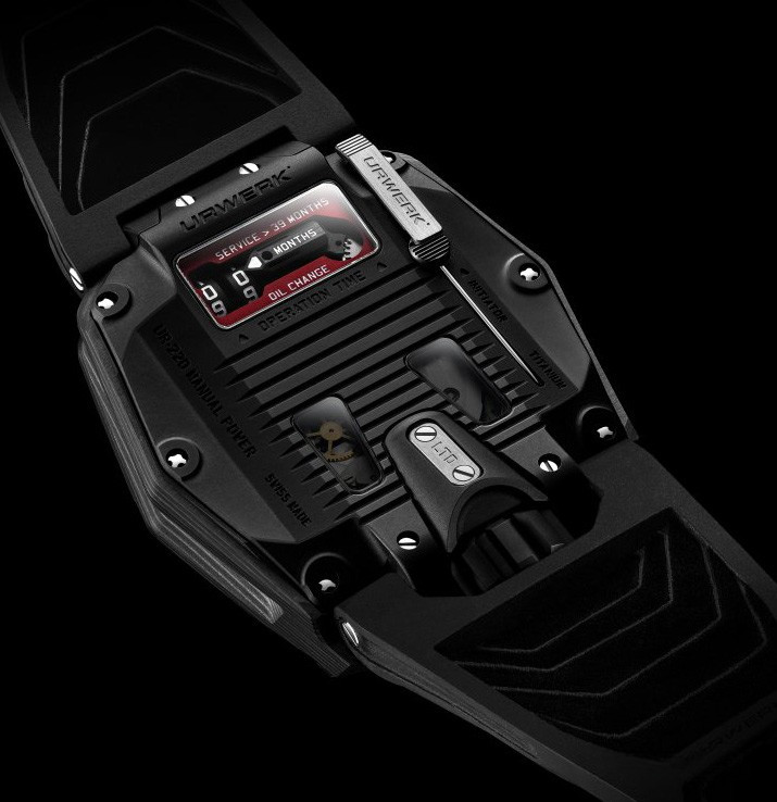 Часы UR-220 Falcon Project представлены в корпусе из карбона размером 43.8 х 53.6 х 14.8 мм водонепроницаемостью 30 метров. Внутри корпуса установлен механизм с ручным заводом, Калибр UR-7.20, обладающий запасом хода 48 часов. На черном циферблате отображаются часы, минуты, запас хода, индикатор смены масла. Часы поставляются на каучуковом ремешке с вставкой из титана.