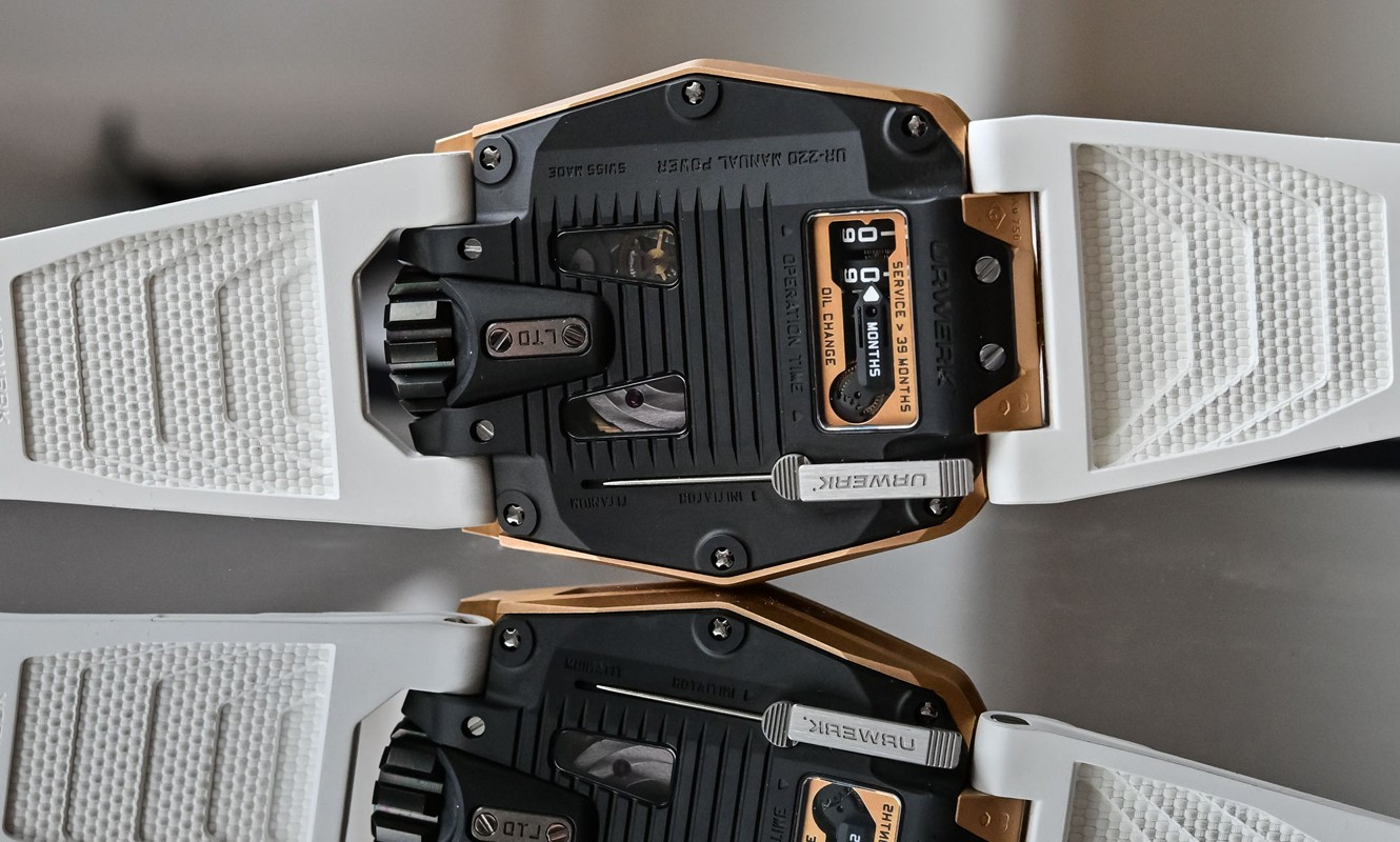 Часы UR-220 представлены в корпусе из розового золота 18к размером 43.8 х 53.6 х 14.8 мм водонепроницаемостью 30 метров. Внутри корпуса установлен механизм с ручным заводом, Калибр UR-7.20, обладающий запасом хода 48 часов. На черном циферблате отображаются часы, минуты, запас хода, индикатор смены масла. Часы поставляются на каучуковом ремешке с золотой застежкой. Серия ограничена (10 шт.)