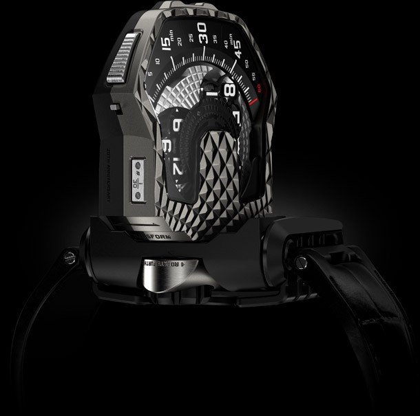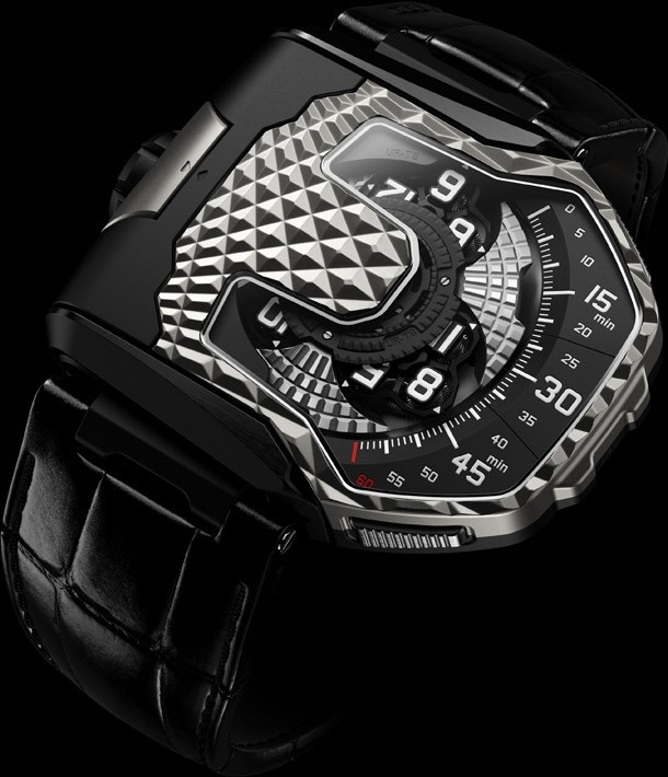 Эта модель знакомит вас с новой версией указателя времени с «блуждающим часом» в исполнении Urwerk – самым интуитивным способом индикации времени. 12 часовых делений, нанесенных на четыре сателлита, проплывают одно за другим перед минутной шкалой, обеспечивая одновременно цифровую и аналоговую индикацию. Это наиболее объемный и сложный механизм карусели, когда-либо создававшийся в Urwerk. Каждый сателлит установлен на карусель, которой управляет так называемая мега-карусель. Весь этот механизм, состоящий из рубинов, зубчатых колес и винтов, приводится в движение сложным планетарным ангренажем, заставляя его выполнять тщательно отрежиссированный танец. Другая уникальная техническая особенность Urwerk – система автоподзавода. Это позолоченная турбина, соединенная с ротором и обеспечивающая постоянный линейный подзавод UR-T8. Сателлитный указатель времени – один из элементов яркого стиля Urwerk, является плодом кропотливого труда часовых дел мастера и соучредителя этого часового дома Феликса Баумгартнера. Модель UR-T8 – истинное олицетворение этой концепции, доступна в первой серии из 60 экземпляров в натуральном титановом исполнении или с покрытием PVD черного цвета.