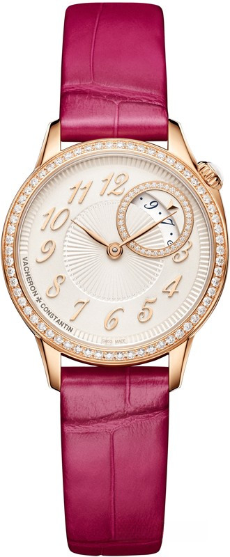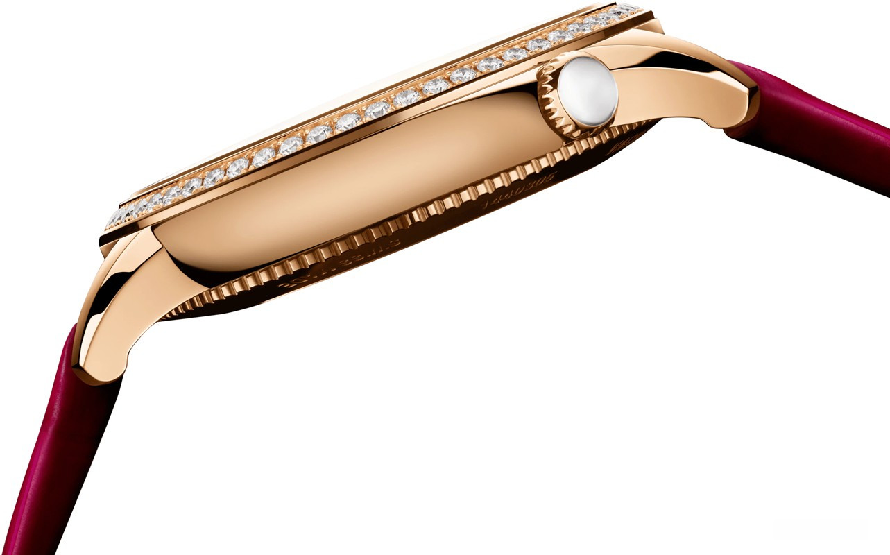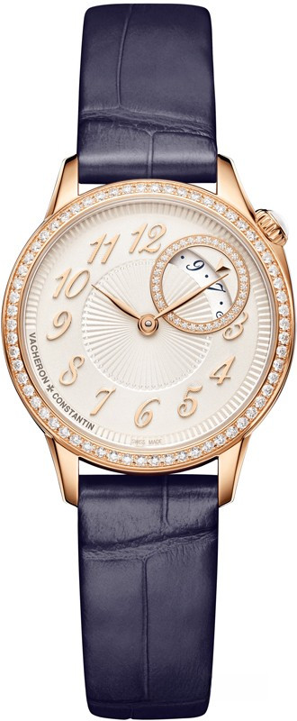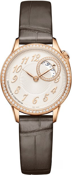 Часы Vacheron Constantin Egerie Quartz выпущены в круглом корпусе из розового золота 18к. Размер составляет 30 х 8.13 мм, водонепроницаемость 30 м. Внутри корпуса установлен кварцевый механизм. На серебристом гильошированной циферблате с белыми бриллиантами отображаются часы, минуты, дата. Часы комплектуются ремешком из кожи аллигатора с вставкой из розового золота 18к. Безель из белых бриллиантов.