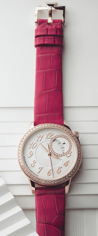 Часы Vacheron Constantin Egerie Self-Winding выпущены в круглом корпусе из розового золота 18к. Размер составляет 35 х 9.32 мм, водонепроницаемость 30 м. Внутри корпуса установлен автоматический механизм, Калибр 1088, обладающий запасом хода 40 часов. На серебристом гильошированной циферблате с белыми бриллиантами отображаются часы, минуты, секунды, дата. Часы комплектуются ремешком из кожи аллигатора с вставкой из розового золота 18к. Безель из белых бриллиантов.