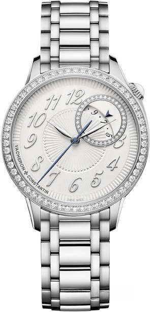 Часы Vacheron Constantin Egerie Self-Winding выпущены в круглом корпусе из нержавеющей стали. Размер составляет 35 х 9.32 мм, водонепроницаемость 30 м. Внутри корпуса установлен автоматический механизм, Калибр 1088, обладающий запасом хода 40 часов. На серебристом гильошированной циферблате с белыми бриллиантами отображаются часы, минуты, секунды, дата. Часы комплектуются браслетом из нержавеющей стали. Безель из белых бриллиантов.