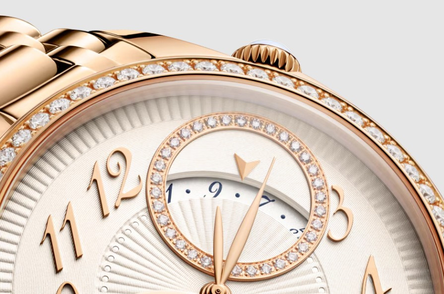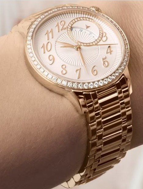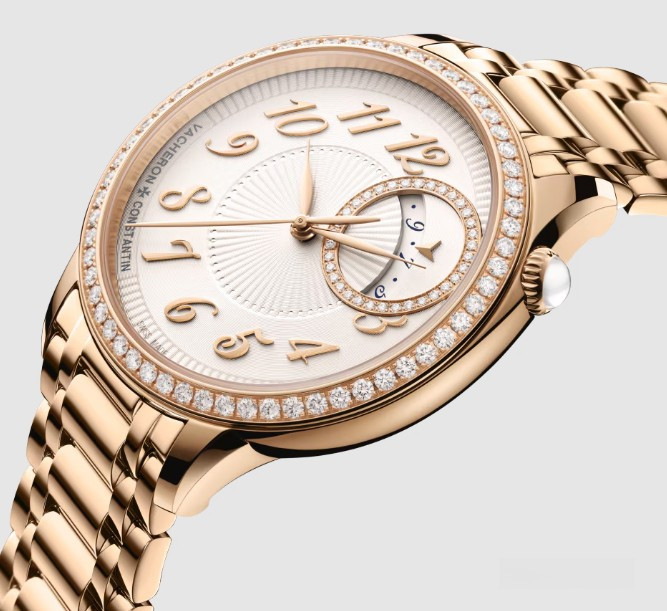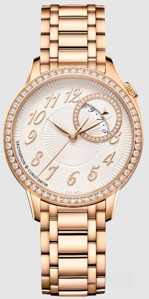 Часы Vacheron Constantin Egerie Self-Winding выпущены в круглом корпусе из розового золота 18к. Размер составляет 35 х 9.54 мм, водонепроницаемость 30 м. Внутри корпуса установлен автоматический механизм, Калибр 1088, обладающий запасом хода 40 часов. На белом циферблате с белыми бриллиантами отображаются часы, минуты, секунды, дата. Часы комплектуются браслетом из розового золота 18к. Безель из белых бриллиантов.