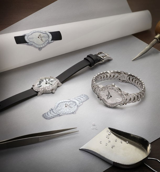Вдохновением для модели Heure Romantique послужил стиль ар-нуво. Безель, изготовленный из белого золота 18 карат и украшенный 104 бриллиантами круглой огранки (весом около 2,5 кар.), вращается вокруг перламутрового циферблата. Четыре бриллианта, закрепленные на ушках, подчеркивают плавные контуры слегка изогнутого корпуса, который венчает заводная головка с бриллиантом. Эти исключительные часы предлагаются с черным атласным ремешком и раскладывающейся застежкой из белого золота, украшенной бриллиантами. На белом жемчужном циферблате отображаются часы и минуты. Внутри корпуса устновлен механизм с ручным заводом.