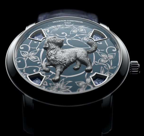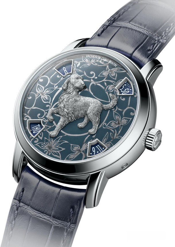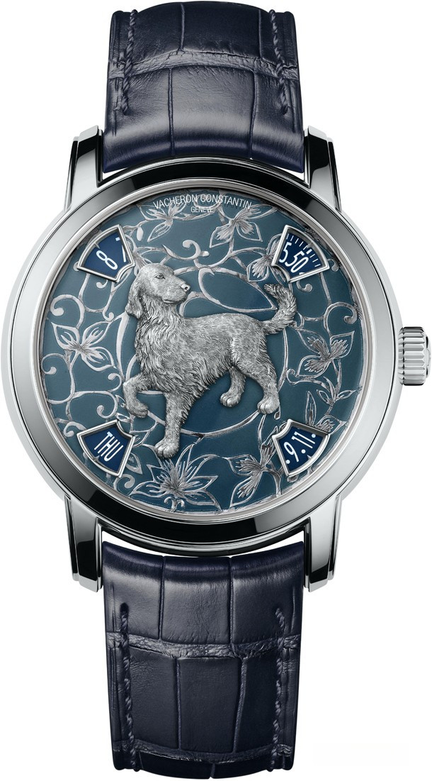 Часы Vacheron Constantin Metiers d`Arts Legend of the Chinese Zodiac 86073/000P-B257 выпущены в круглом корпусе из платины. Размер составляет 40 х 12,74 мм, водонепроницаемость 30 м. Внутри корпуса установлен автоматический механизм, Калибр 2460 G4, обеспечивающий запас хода 40 часов. На синем циферблате с эмалью Grand Feu, с гравированной вручную фигуркой собаки в апертурах отображаются часы, минуты, дата, день недели. Часы комплектуются ремешком из кожи аллигатора с вставкой из платины. Часы представлены ограниченной серией (12 шт.)