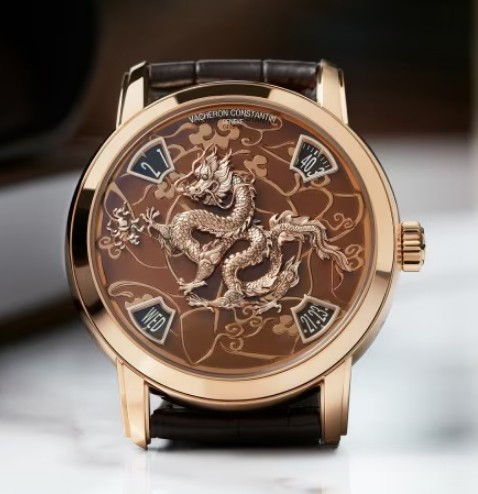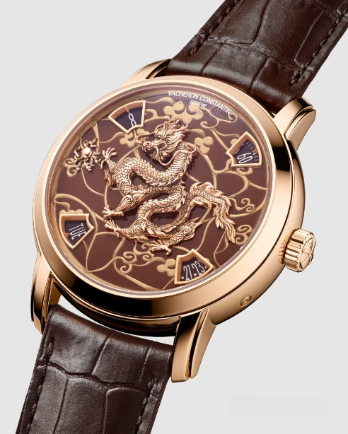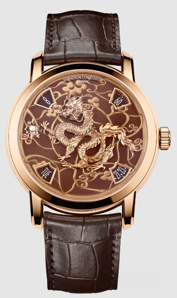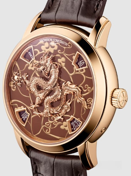Часы Vacheron Constantin Metiers d`Arts Legend of the Chinese Zodiac выпущены в круглом корпусе из розового золота 18к. Размер составляет 40 х 12,74 мм, водонепроницаемость 30 м. Внутри корпуса установлен автоматический механизм, Калибр 2460 G4/2, обеспечивающий запас хода 40 часов. На коричневом циферблате с эмалью Grand Feu, с гравированной вручную фигуркой дракона в апертурах отображаются часы, минуты, дата, день недели. Часы комплектуются ремешком из кожи аллигатора с золотой застежкой. Часы представлены ограниченной серией 12 шт.