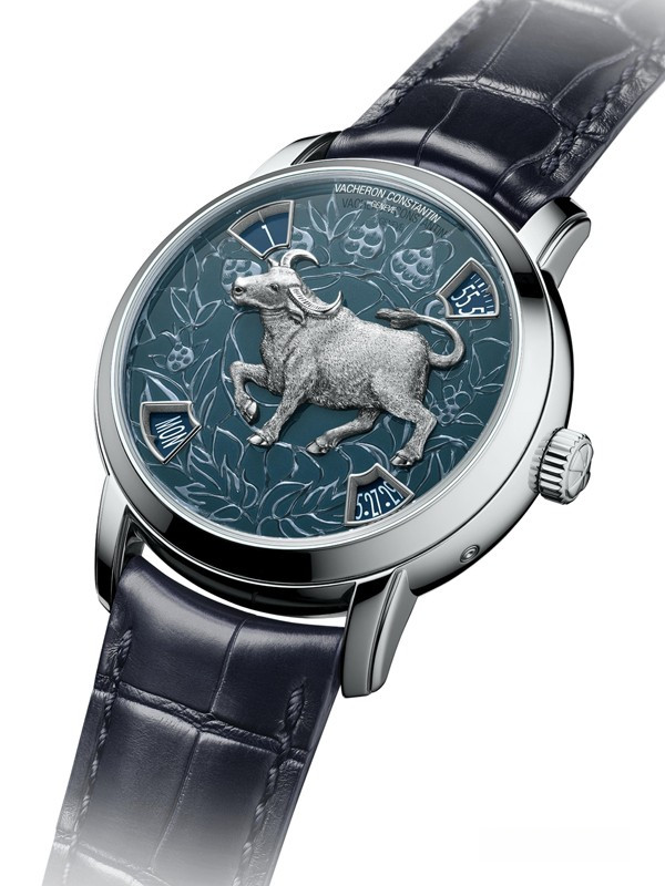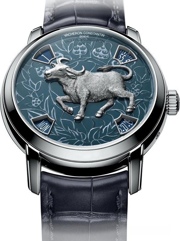 Часы Vacheron Constantin Metiers d`Arts Legend of the Chinese Zodiac выпущены в круглом корпусе из платины 950. Размер составляет 40 х 12,74 мм, водонепроницаемость 30 м. Внутри корпуса установлен автоматический механизм, Калибр 2460 G4/2, обеспечивающий запас хода 40 часов. На синем циферблате с эмалью Grand Feu, с гравированной вручную фигуркой быка в апертурах отображаются часы, минуты, дата, день недели. Часы комплектуются ремешком из кожи аллигатора с вставкой из платины 950. Часы представлены ограниченной серией 12 шт.
