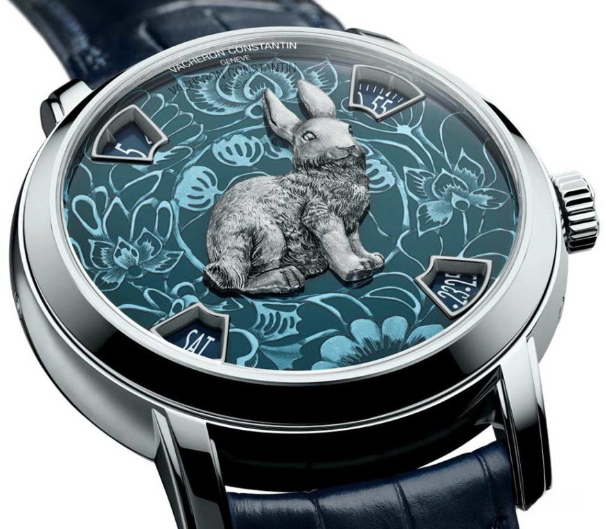 Часы Vacheron Constantin Metiers d`Arts Legend of the Chinese Zodiac выпущены в круглом корпусе из платины 950. Размер составляет 40 х 12,74 мм, водонепроницаемость 30 м. Внутри корпуса установлен автоматический механизм, Калибр 2460 G4/2, обеспечивающий запас хода 40 часов. На синем циферблате с эмалью Grand Feu, с гравированной вручную фигуркой кролика в апертурах отображаются часы, минуты, дата, день недели. Часы комплектуются ремешком из кожи аллигатора с застежкой из платины 950. Часы представлены ограниченной серией 12 шт.