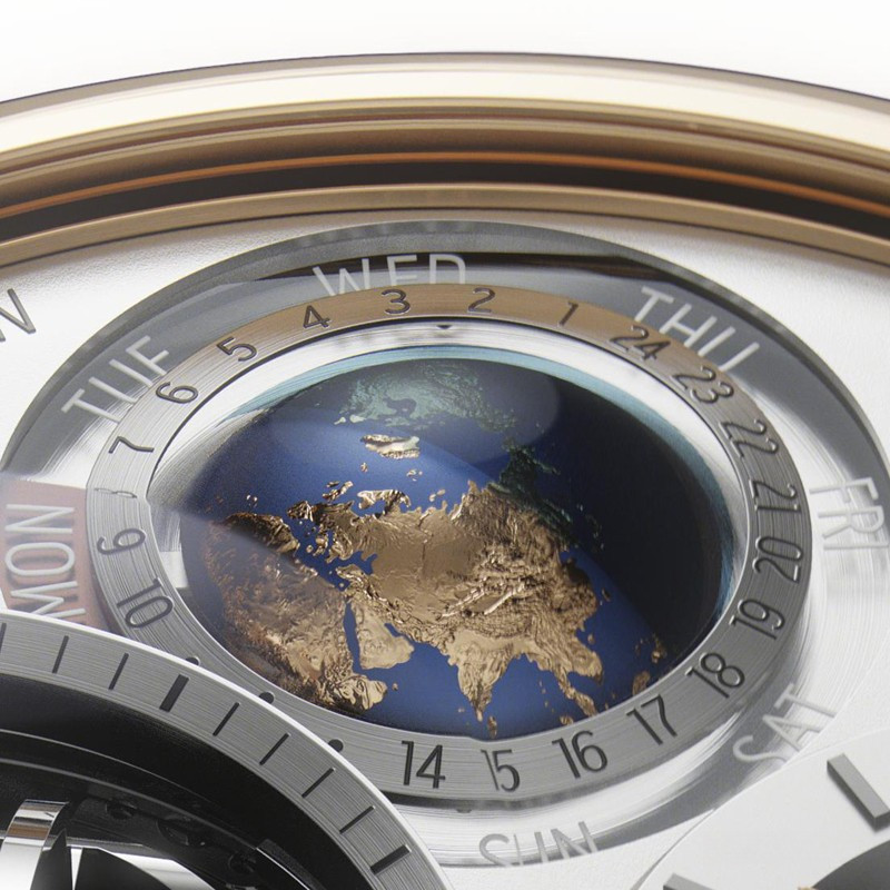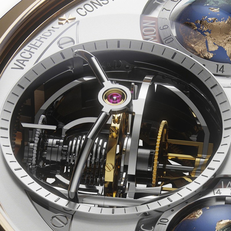 Высокотехнологичное изделие Vacheron Constantin Les Cabinotiers Armillary Tourbillon Perpetual Calendar Planetaria в единичном экземпляре с армиллярным турбийоном и вечным календарем — в часах Planetaria изысканные усложнения предстают в уникальной знаковой эстетике. Эти часы, оснащенные новым мануфактурным механизмом, калибром 1991, — ода непревзойденной астрономической функции: вечному календарю с точным указателем фаз Луны. Эти часы с ретроградной индикацией даты вдоль дуги справа на циферблате, круговыми ретроградными индикаторами месяца и дня недели, которые обрамляют две полусферы в виде полушарий Земли, служащие для индикации дня/ночи, также регулируются двухосным турбийоном. Эта новая модель, представленная на выставке Watches & Wonders — 2021, вписывается в общую тему Дома на 2021 год — «Классика в новом исполнении», которая освещает уникальный творческий дух Vacheron Constantin, прославляющий наследие и стремящийся к беспрецедентному.