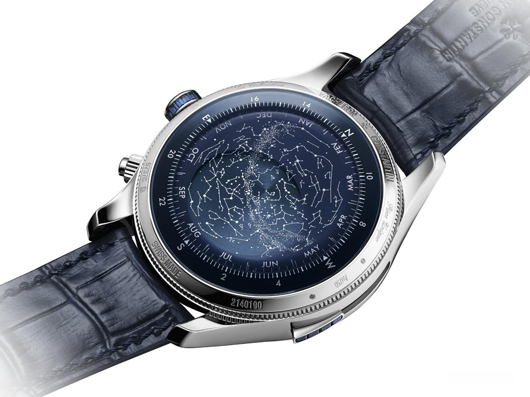 Часы Vacheron Constantin Les Cabinotiers Minute Repeater Tourbillon Sky Chart представлены в корпусе из белого золота 18к размером 45 х 15.1 мм водонепроницаемостью 30 метров. Внутри корпуса установлен с ручным заводом, Калибр 2755 TMRCC, обладающий запасом хода 58 часов. На синем циферблате с белыми бриллиантами отображаются часы, минуты, секунды, турбийон. На обратной стороне корпуса изображена карта звездного неба. Часы поставляются на ремешке из кожи аллигатора с вставкой из белого золота 18к. Корпус инкрустирован синими багетными сапфирами. Серия ограничена - 1 шт.