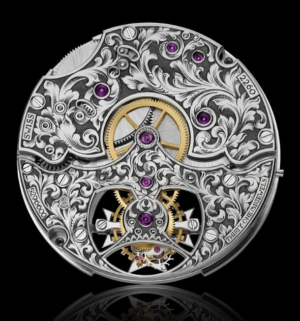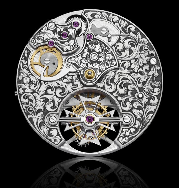 Гравированный механический калибр 2660/1 с ручным заводом, помещенный в безупречно круглый корпус диаметром 41 мм (платина 950-й пробы) с безелем особой вогнутой формы, оснащен турбийоном и имеет впечатляющий запас хода 14 дней. Благодаря слегка смещенным от центра часовой и минутной стрелкам взгляду открывается каретка турбийона и малый секундный счетчик. Запас хода отображается с помощью «ползущей» стрелки, которая показывает количество оставшейся энергии на 280-градусной шкале. Считывание показаний этой стрелки облегчается благодаря увеличенному размеру шкалы: это позволяет нанести более точные деления, соответствующие 14 дням, каждое из которых, в свою очередь, поделено на два отрезка по 12 часов. Конструкция механизма, состоящего из 231 детали, включает два крупных моста с изящной гравировкой в виде цветов и листьев аканта. Их можно увидеть через сапфировое стекло задней крышки корпуса, водонепроницаемость которого составляет 30 метров. Циферблат часов Métiers d’Art Mécaniques Gravées с турбийоном и запасом хода 14 дней от Vacheron Constantin предлагает потрясающее зрелище каретки турбийона в форме мальтийского креста, украшенной невероятно изысканной отделкой. На защищенном сапфировым стеклом циферблате со стрелками из белого золота, тонированными в цвет антрацита, можно увидеть два типа деталей.Малый секундный счетчик и шкала запаса хода с гравировкой и нанесенными краской делениями отличаются матовой отделкой, которая облегчает считывание показаний, а кольцо с минутными делениями и мальтийским крестом из белого золота имеет грифельный оттенок. Завораживающие узоры из завитков и арабесков, видимые сквозь прозрачный циферблат, подчеркивают неповторимую красоту и исключительную элегантность этого подлинного произведения искусства — часового механизма с выполненной вручную гравировкой, которая требует более недели кропотливой работы.