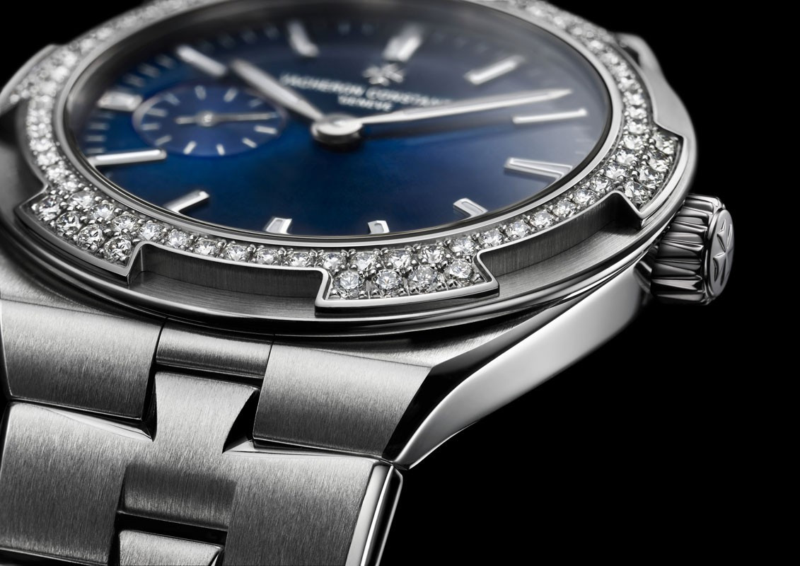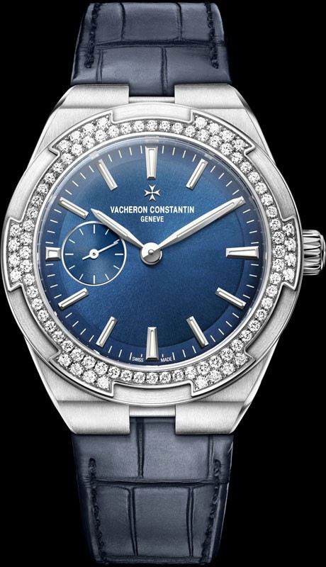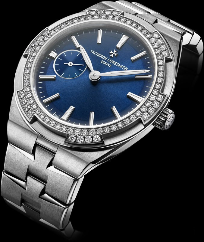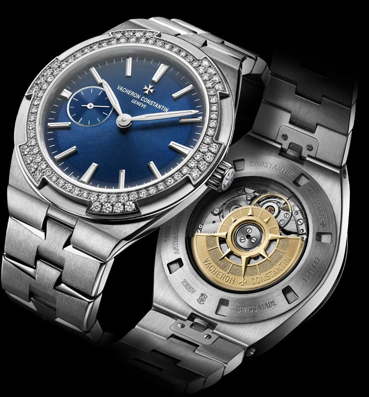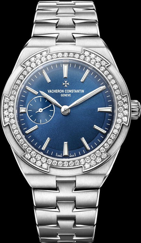 Часы сертифицированы Женевским клеймом. Калибр 5300 разработан и произведен Vacheron Constantin. Механический, с автоматическим подзаводом. Запас хода около 44 часов. Индикация: часы, минуты, малая секундная стрелка в положении «9 часов». Корпус: нержавеющая сталь. Безель украшен бриллиантами (84 бриллианта круглой огранки). Диаметр 37 мм, толщина 10,8 мм. Экран из мягкой стали обеспечивает антимагнитную защиту. Завинчивающаяся заводная головка. Прозрачная задняя крышка корпуса из сапфирового стекла. Водонепроницаемость проверена под давлением в 15 бар (около 150 метров). Циферблат: полупрозрачное лаковое покрытие синего цвета, с матовой отделкой и узором «солнечные лучи», минутная шкала с бархатистой кромкой. Часовые метки, часовая и минутная стрелки из золота 18 карат подсвечиваются белым люминесцентным материалом. Стальной браслет, звенья в форме половинки мальтийского креста с полированной и матовой отделкой. В комплект входит: второй ремешок розово-бежевого/синего цвета из кожи миссисипского аллигатора с подкладкой из черного нубука и эффектом микроперфорации, ручная работа, крупный квадратный рисунок; третий ремешок из розово-бежевого/синего каучука. Общая закрепка бриллиантов 84 бриллианта круглой огранки общим весом около 1 карата.