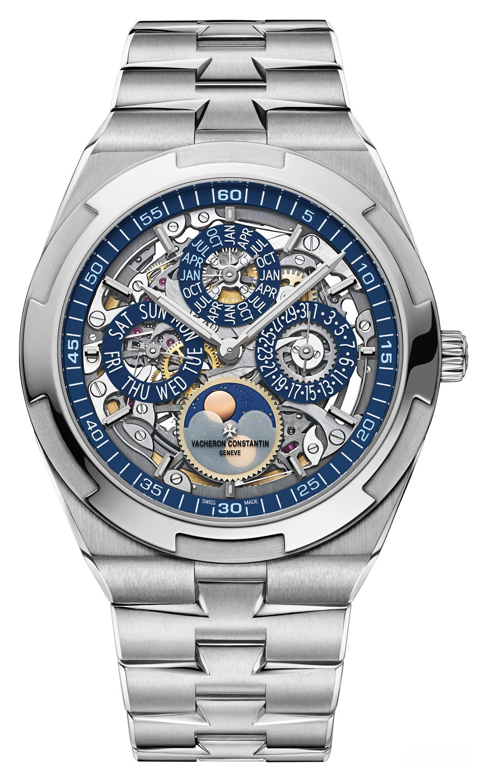Часы Vacheron Constantin Overseas Skeleton Perpetual Calendar представлены в корпусе из белого золота 18к размером 41.5 х 8.1 мм водонепроницаемостью 50 метров. Внутри корпуса находится автоматический скелетированный механизм, Калибр 1120 QPSQ/1, обладающий запасом хода 40 часов. На синем циферблате отображаются часы, минуты, дата, день недели, месяц, фаза луны, цикл високосного года. Часы поставляются на браслете из белого золота 18к.