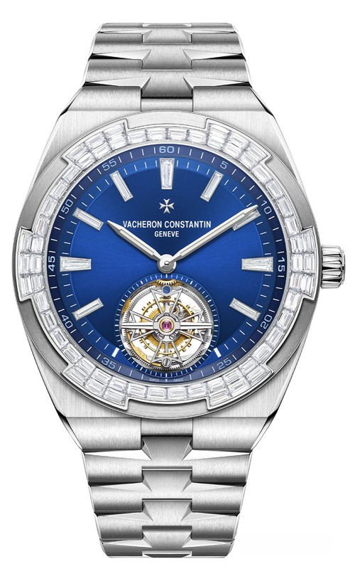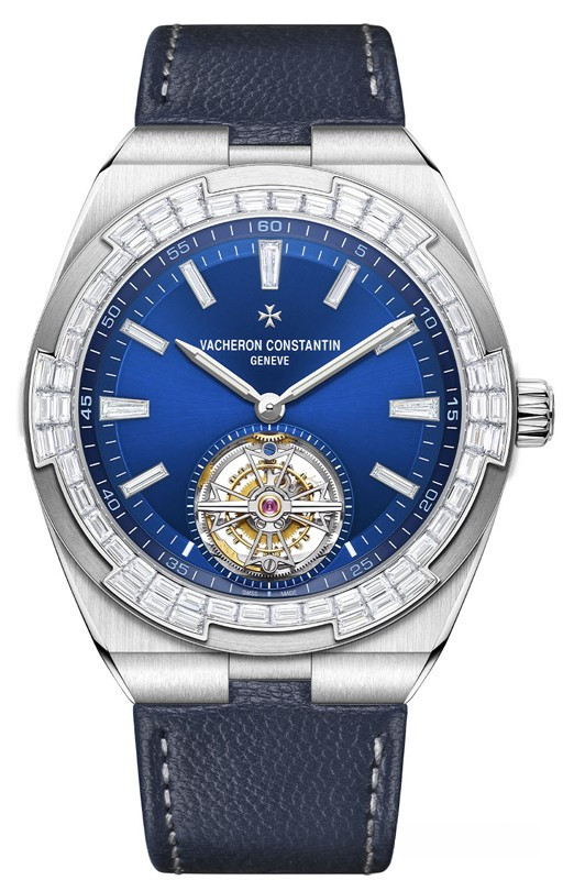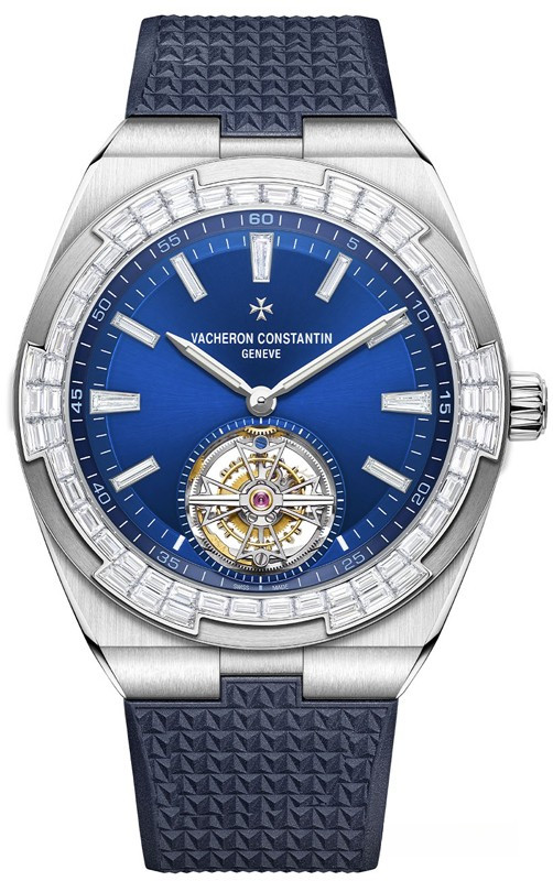 Часы Overseas с турбийоном представлены в корпусе из белого золота 18к размером 42.5 х 10.39 мм, водонепроницаемостью 50 м. Кольцо из мягкого железа, обеспечивающее антимагнитную защиту. Прозрачная задняя крышка корпуса из сапфирового стекла. Внутри корпуса установлен автоматический механизм, Калибр 2160, обладающий запасом хода 80 часов. Часы сертифицированы Женевским клеймом. На синем циферблате отображаются часы, минуты, секундная стрелка расположена на клети турбийона. Золотой браслет, полированные и сатинированные звенья в виде половинок мальтийского креста. Поставляется в комплекте со вторым кожаным ремешком синего цвета. Поставляется в комплекте с третьим ремешком из каучука синего цвета. Браслет из белого золота 18к с тройной раскладывающейся застежкой и системой регулировки длины браслета. Безель из белых багетных бриллиантов.