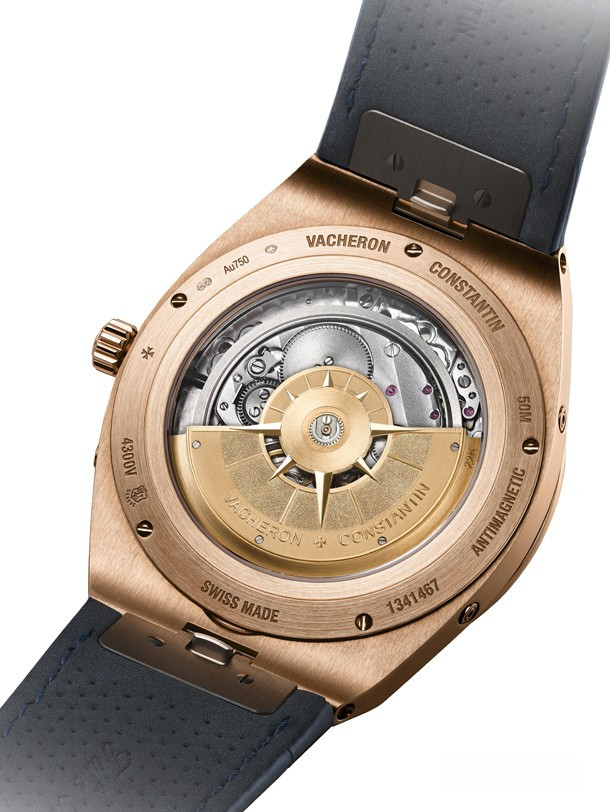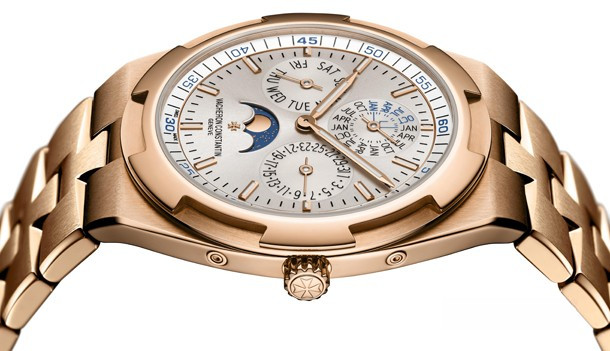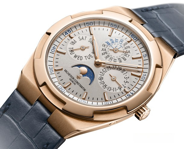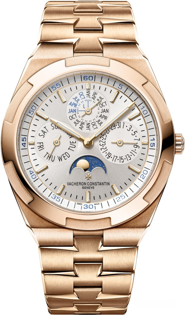 Ультратонкие часы Overseas с вечным календарем. Часы сертифицированы Женевским клеймом. Калибр 1120 QP/1 разработан и произведен Vacheron Constantin. Механический, с автоматическим подзаводом. Запас хода около 40 часов. Индикация: часы, минуты, вечный календарь (окошко даты, день недели, месяц, високосный год), фазы Луны. Корпус: розовое золото 18 карат. Диаметр 41,5 мм, толщина 8,1 мм. Экран из мягкой стали обеспечивает антимагнитную защиту. Прозрачная задняя крышка корпуса из сапфирового стекла. Водонепроницаемость проверена под давлением в 5 бар (около 50 метров). Циферблат серебристого цвета. Часовые метки, часовая и минутная стрелки из золота 18 карат подсвечиваются белым люминесцентным материалом. Часы комплектуются браслетом из розового золота 18к.