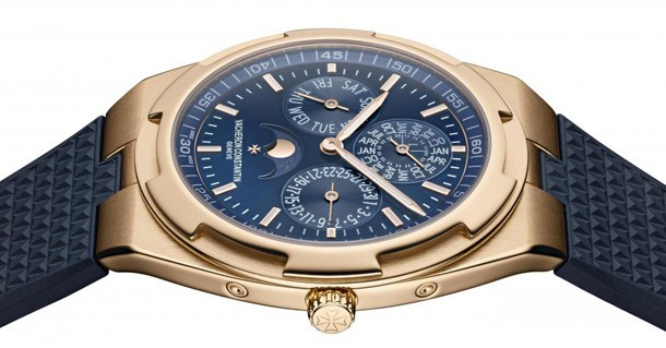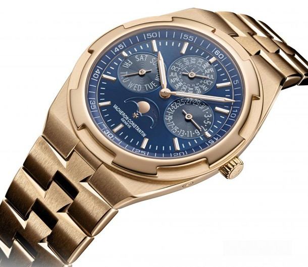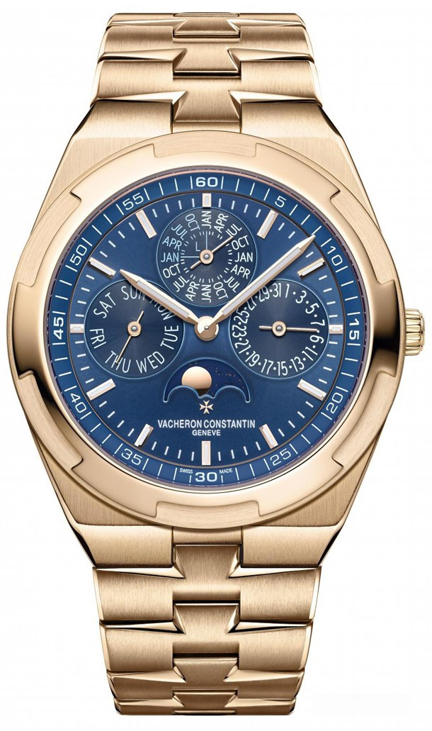 Ультратонкие часы Overseas с вечным календарем. Часы сертифицированы Женевским клеймом. Калибр 1120 QP/1 разработан и произведен Vacheron Constantin. Механический, с автоматическим подзаводом. Запас хода около 40 часов. Индикация: часы, минуты, вечный календарь (окошко даты, день недели, месяц, високосный год), фазы Луны. Корпус: розовое золото 18 карат. Диаметр 41.5 мм, толщина 8.1 мм. Экран из мягкой стали обеспечивает антимагнитную защиту. Прозрачная задняя крышка корпуса из сапфирового стекла. Водонепроницаемость проверена под давлением в 5 бар (около 50 метров). Циферблат синего цвета. Часовые метки, часовая и минутная стрелки из золота 18 карат подсвечиваются белым люминесцентным материалом. Часы комплектуются браслетом из розового золота 18к. Дополнительные ремешки из каучука и кожи аллигатора.