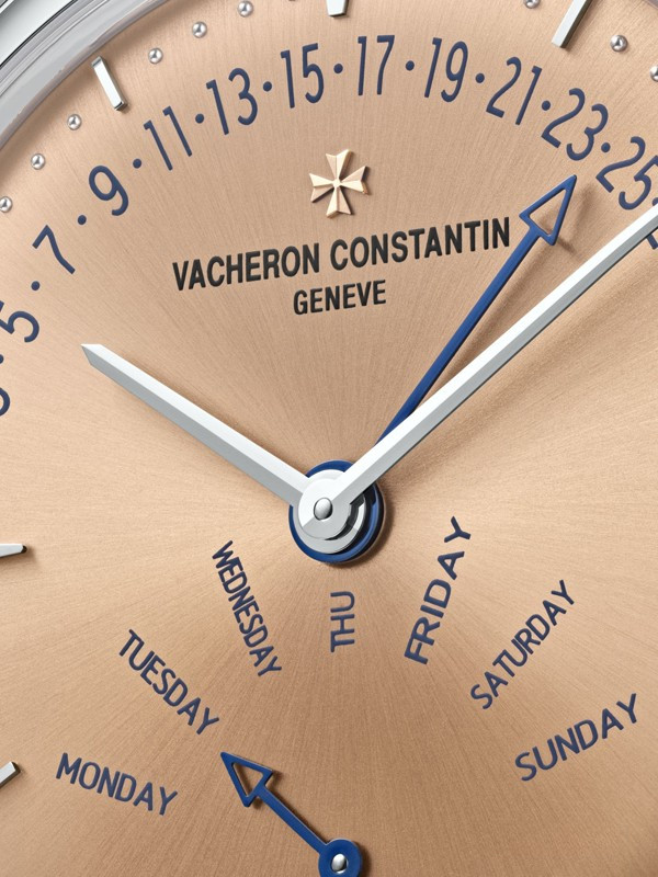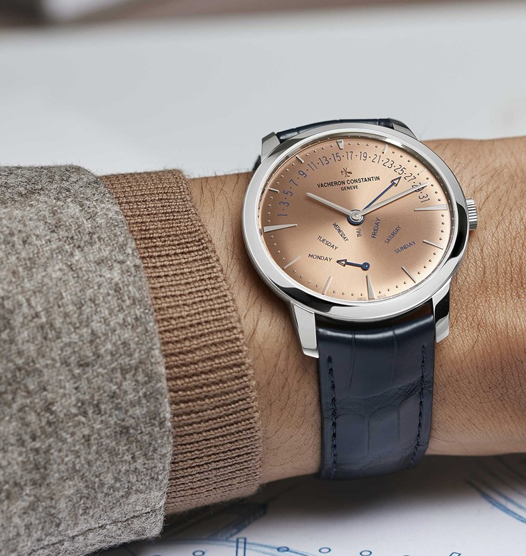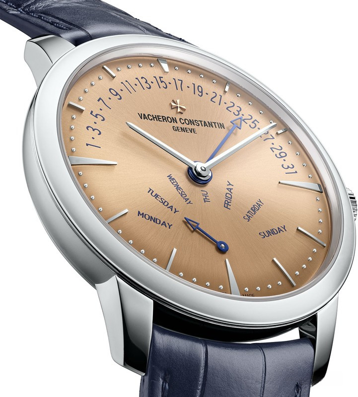 Часы Vacheron Constantin Patrimony Retrograde Day and Date выпущены в корпусе из платины 950, размером 42.5 х 9.7 мм и водонепроницаемостью 30 м. Внутри корпуса установлен автоматический механизм, Калибр 2460R31R7/2. На золотистом циферблате отображаются часы, минуты, дата, день недели. Запас хода 40 часов. Часы комплектуются ремешком из кожи аллигатора с платиновой застежкой.