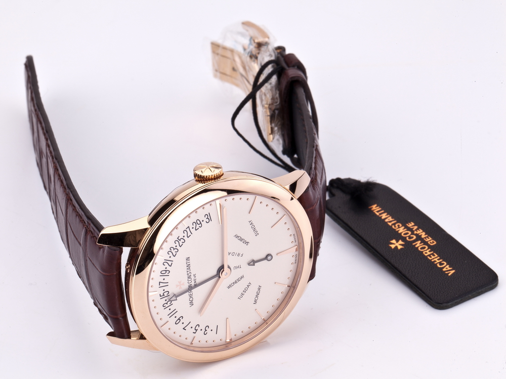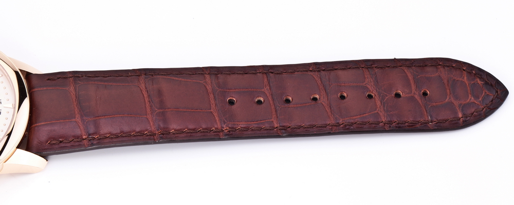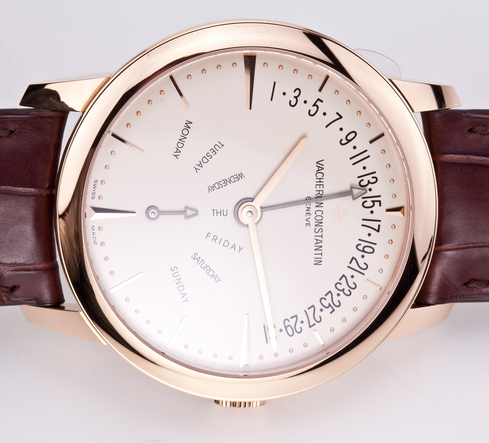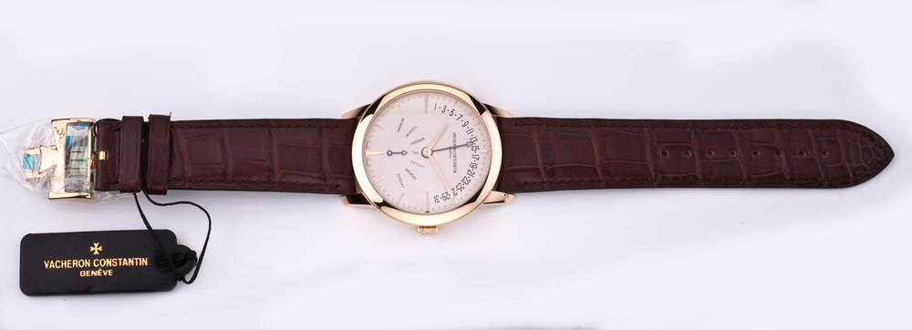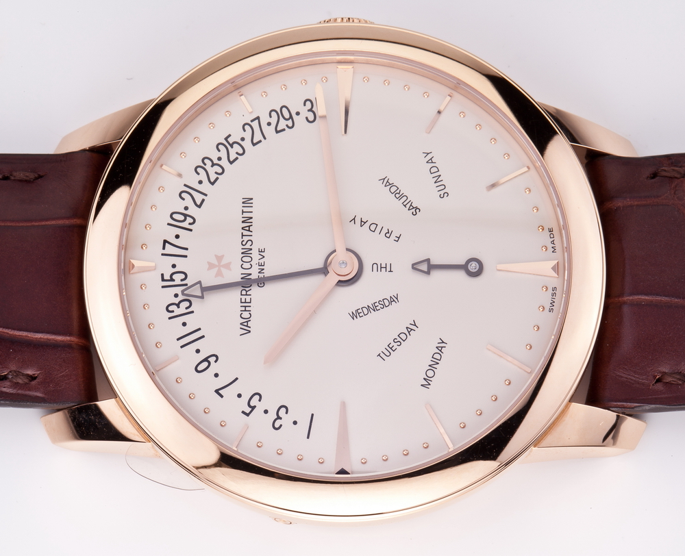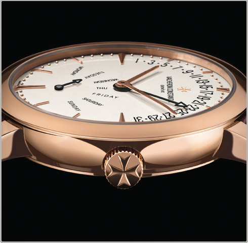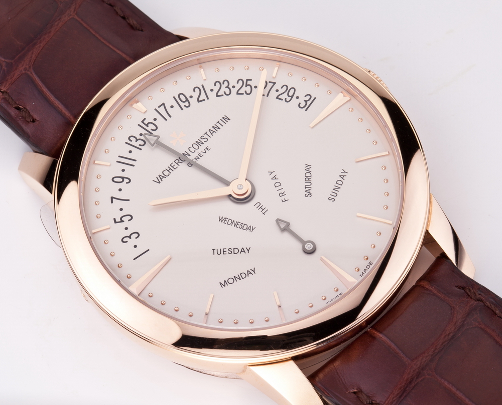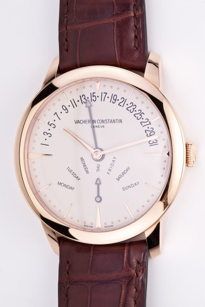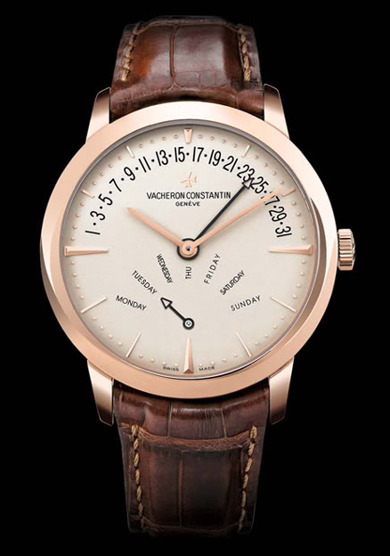 Patrimony («Наследие») – самая знаменитая коллекция женевского бренда Vacheron Constantin. Она служит образцом классического стиля швейцарских часов и «лицом» бренда. Серия Contemporaine Bi-Retrograde Day-Date, пожалуй, самая сдержанная и аристократическая линейка коллекции, была представлена в 2007 году. Дизайн часов изящен и консервативен, но за его внешней простотой скрывается сложный механизм, точность и выверенность функций и деталей. Кроме традиционной индикации часов и минут, часы снабжены двумя самыми полезными «усложнениями» – показателями числа и дня недели. Их отображение удачно реализовано с помощью двух ретроградных указателей в верхней и нижней частях циферблата, соответственно. Достигнув крайнего значения, стрелка указателя возвращается в исходное положение менее чем за 1/10 долю секунды. Часы имеют ультратонкий корпус из розового золота толщиной всего 10 мм, в который помещен калибр 2460 R31 R7 с женевским клеймом. Механизм имеет ротор из гильошированного желтого золота 22 карат, состоит 283 деталей, 27 камней. Его баланс имеет частоту колебаний 28800 полуколебаний в час. Запас хода составляет 40 часов, чего вполне достаточно, с учетом наличия автоматического подзавода. Декорированный фрагмент калибра виден за задней крышкой часов в апертуре, покрытой сапфировым стеклом. Ремешок выполнен из коричневой кожи аллигатора и имеет золотую застежку с фирменным знаком бренда – мальтийским крестом.