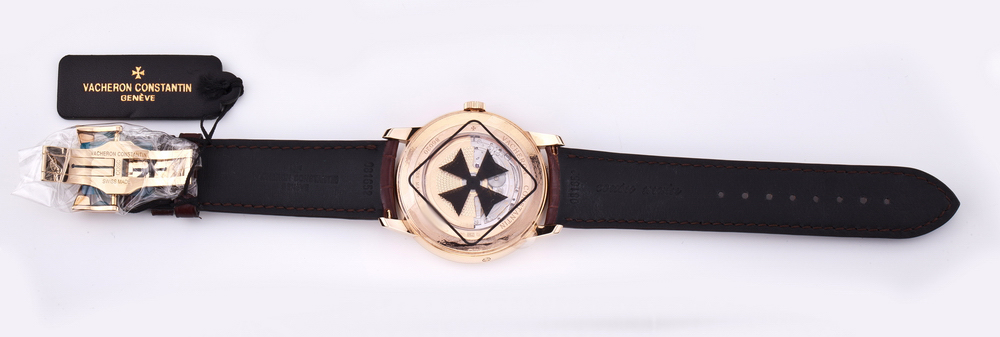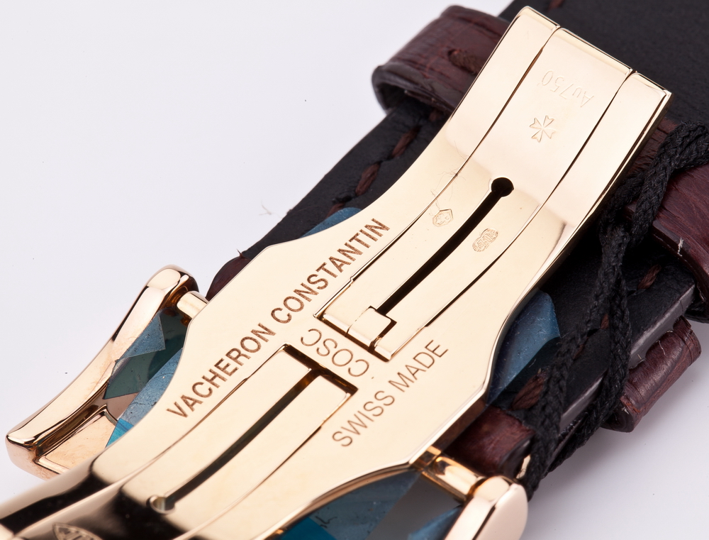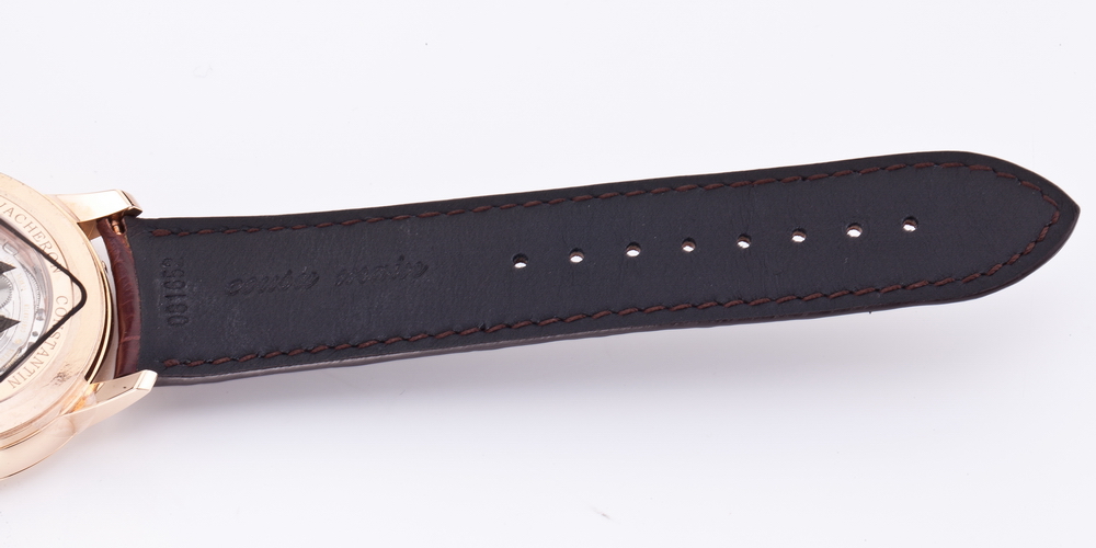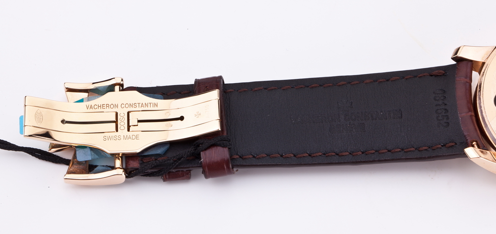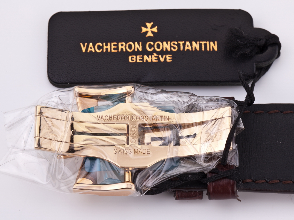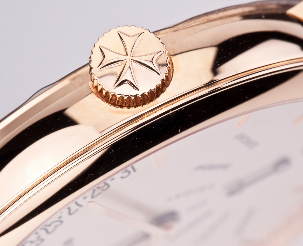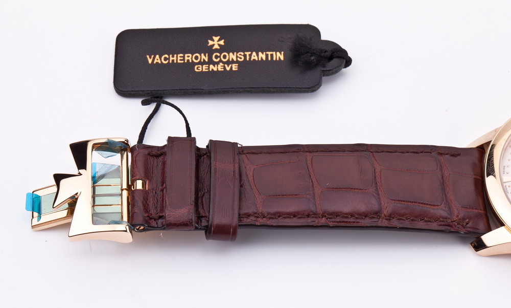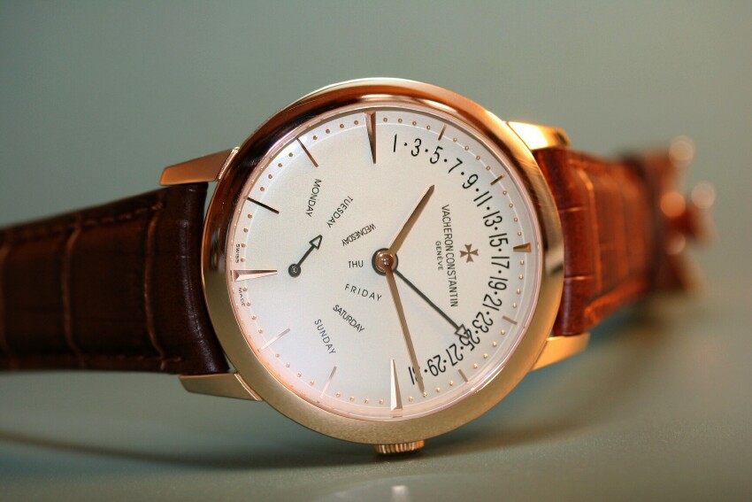 Patrimony («Наследие») – самая знаменитая коллекция женевского бренда Vacheron Constantin. Она служит образцом классического стиля швейцарских часов и «лицом» бренда. Серия Contemporaine Bi-Retrograde Day-Date, пожалуй, самая сдержанная и аристократическая линейка коллекции, была представлена в 2007 году. Дизайн часов изящен и консервативен, но за его внешней простотой скрывается сложный механизм, точность и выверенность функций и деталей. Кроме традиционной индикации часов и минут, часы снабжены двумя самыми полезными «усложнениями» – показателями числа и дня недели. Их отображение удачно реализовано с помощью двух ретроградных указателей в верхней и нижней частях циферблата, соответственно. Достигнув крайнего значения, стрелка указателя возвращается в исходное положение менее чем за 1/10 долю секунды. Часы имеют ультратонкий корпус из розового золота толщиной всего 10 мм, в который помещен калибр 2460 R31 R7 с женевским клеймом. Механизм имеет ротор из гильошированного желтого золота 22 карат, состоит 283 деталей, 27 камней. Его баланс имеет частоту колебаний 28800 полуколебаний в час. Запас хода составляет 40 часов, чего вполне достаточно, с учетом наличия автоматического подзавода. Декорированный фрагмент калибра виден за задней крышкой часов в апертуре, покрытой сапфировым стеклом. Ремешок выполнен из коричневой кожи аллигатора и имеет золотую застежку с фирменным знаком бренда – мальтийским крестом.