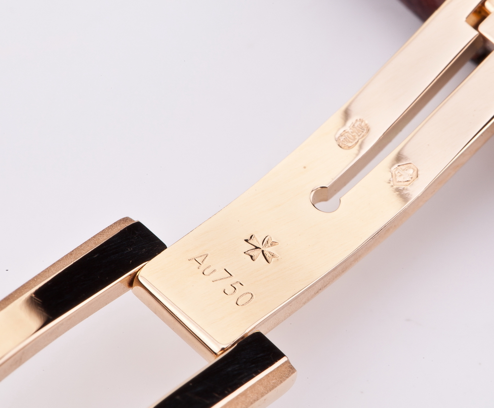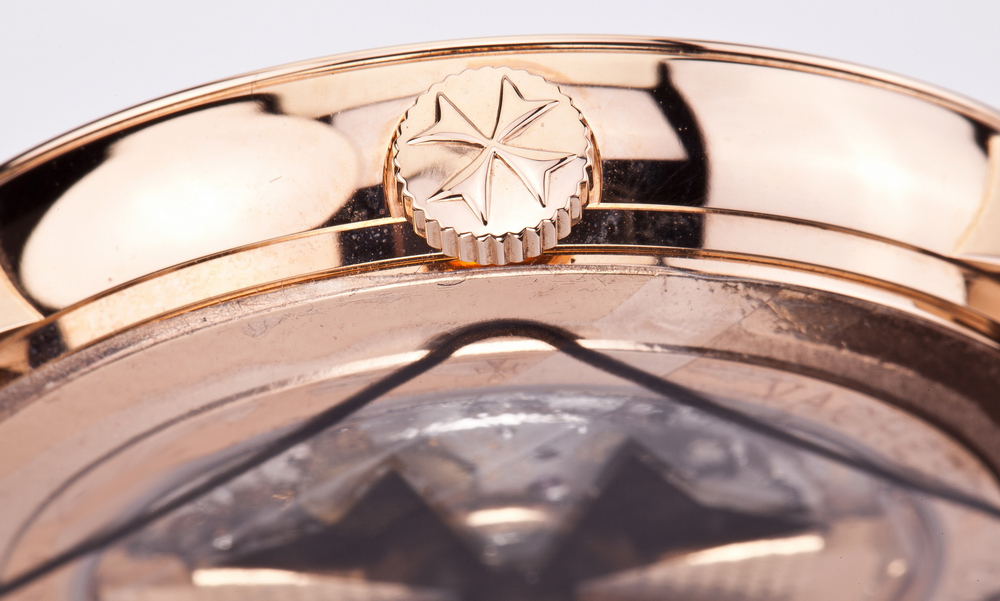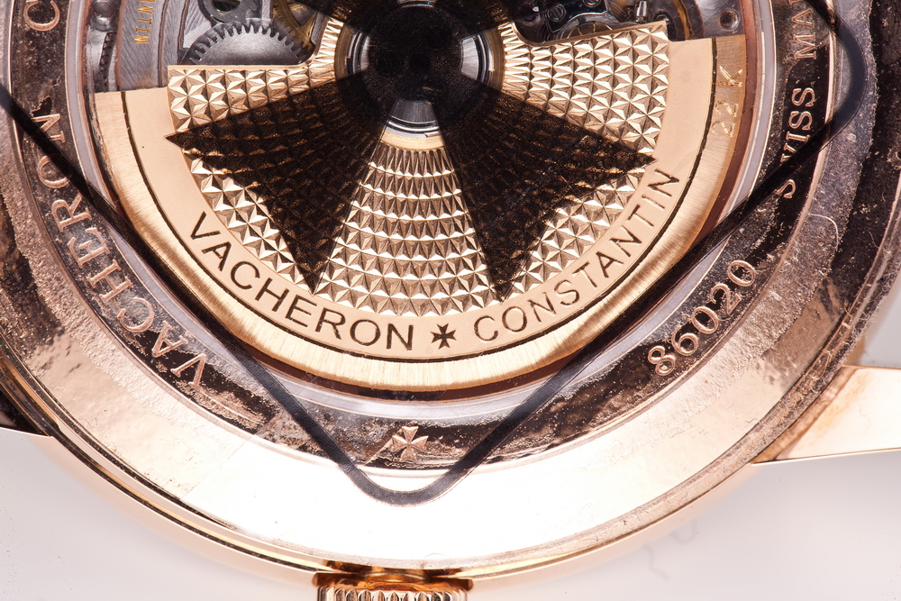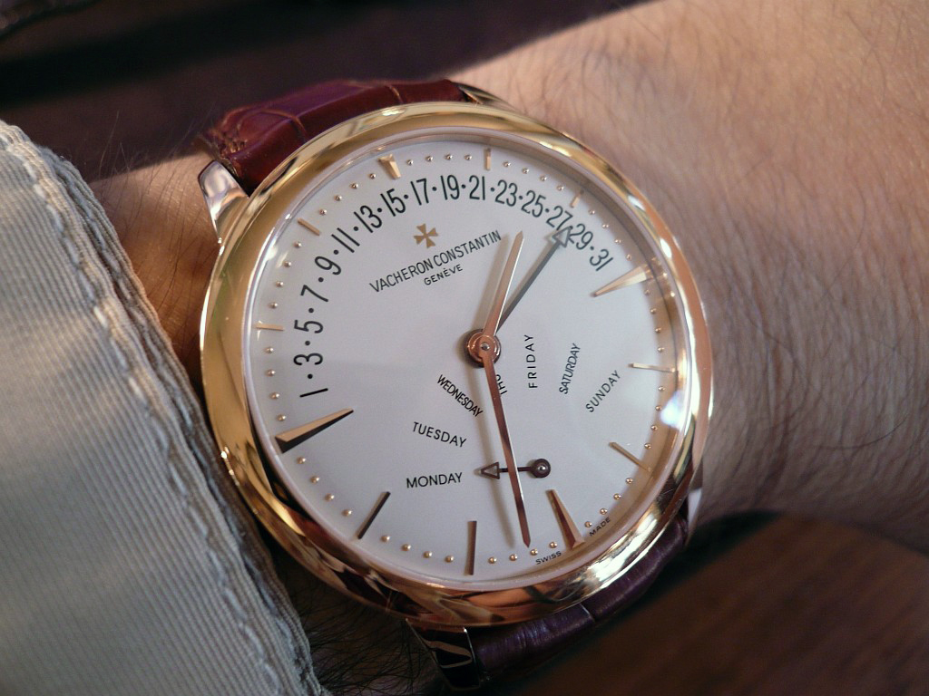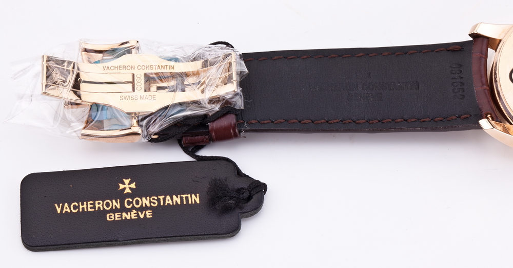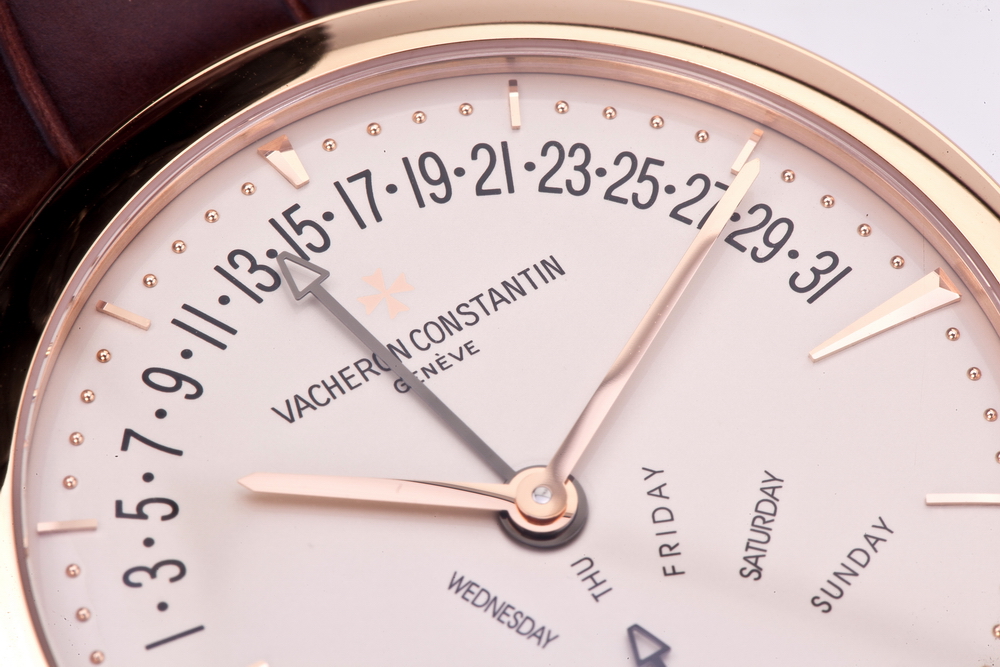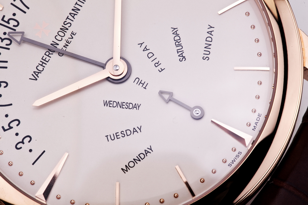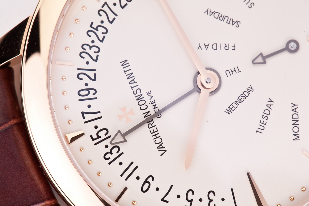 Patrimony («Наследие») – самая знаменитая коллекция женевского бренда Vacheron Constantin. Она служит образцом классического стиля швейцарских часов и «лицом» бренда. Серия Contemporaine Bi-Retrograde Day-Date, пожалуй, самая сдержанная и аристократическая линейка коллекции, была представлена в 2007 году. Дизайн часов изящен и консервативен, но за его внешней простотой скрывается сложный механизм, точность и выверенность функций и деталей. Кроме традиционной индикации часов и минут, часы снабжены двумя самыми полезными «усложнениями» – показателями числа и дня недели. Их отображение удачно реализовано с помощью двух ретроградных указателей в верхней и нижней частях циферблата, соответственно. Достигнув крайнего значения, стрелка указателя возвращается в исходное положение менее чем за 1/10 долю секунды. Часы имеют ультратонкий корпус из розового золота толщиной всего 10 мм, в который помещен калибр 2460 R31 R7 с женевским клеймом. Механизм имеет ротор из гильошированного желтого золота 22 карат, состоит 283 деталей, 27 камней. Его баланс имеет частоту колебаний 28800 полуколебаний в час. Запас хода составляет 40 часов, чего вполне достаточно, с учетом наличия автоматического подзавода. Декорированный фрагмент калибра виден за задней крышкой часов в апертуре, покрытой сапфировым стеклом. Ремешок выполнен из коричневой кожи аллигатора и имеет золотую застежку с фирменным знаком бренда – мальтийским крестом.