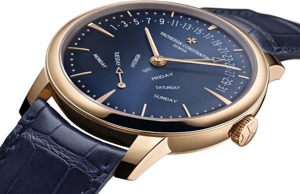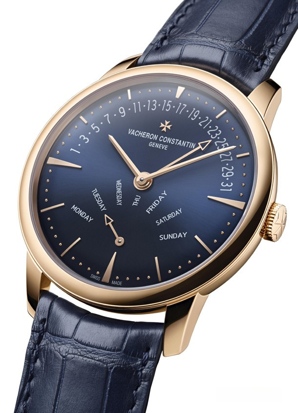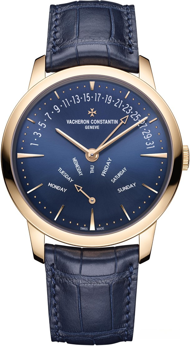 Часы Vacheron Constantin Patrimony Retrograde Day and Date выпущены в корпусе из розового золота 18к, размером 42.5 х 9.7 мм и водонепроницаемостью 30 м. Внутри корпуса установлен автоматический механизм, Калибр 2460R31R7/2. На синем циферблате отображаются часы, минуты, дата, день недели. Запас хода 40 часов. Часы комплектуются ремешком из кожи аллигатора с вставкой из розового золота 18к.