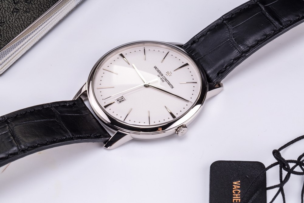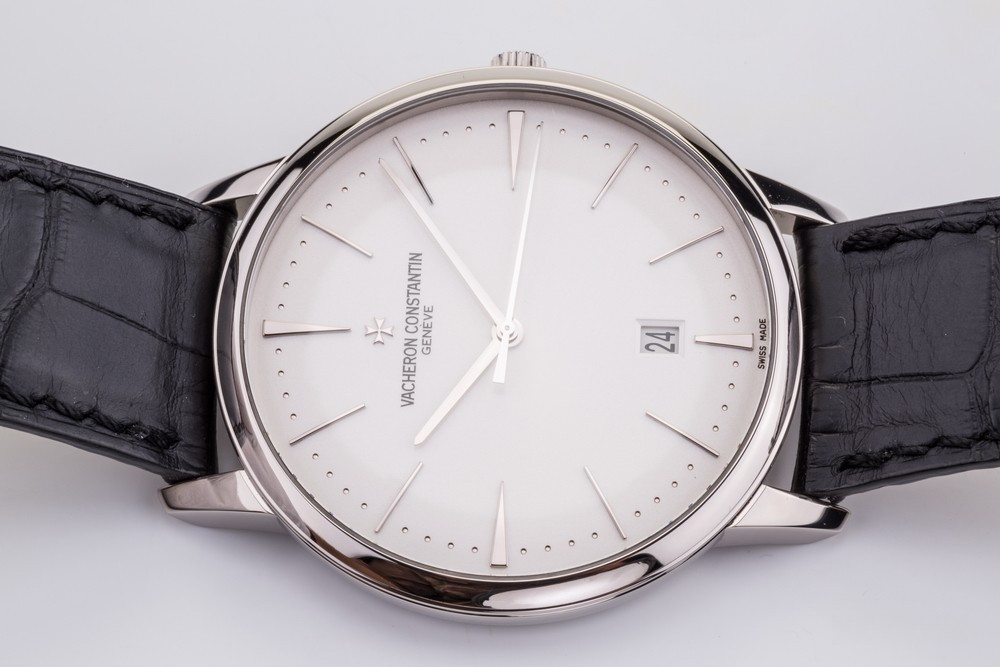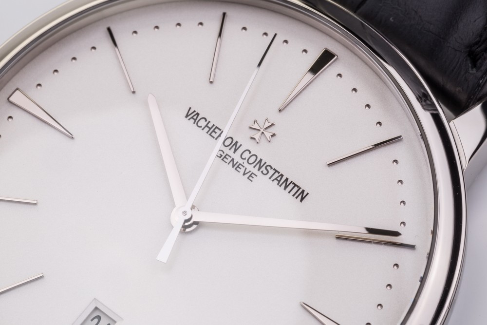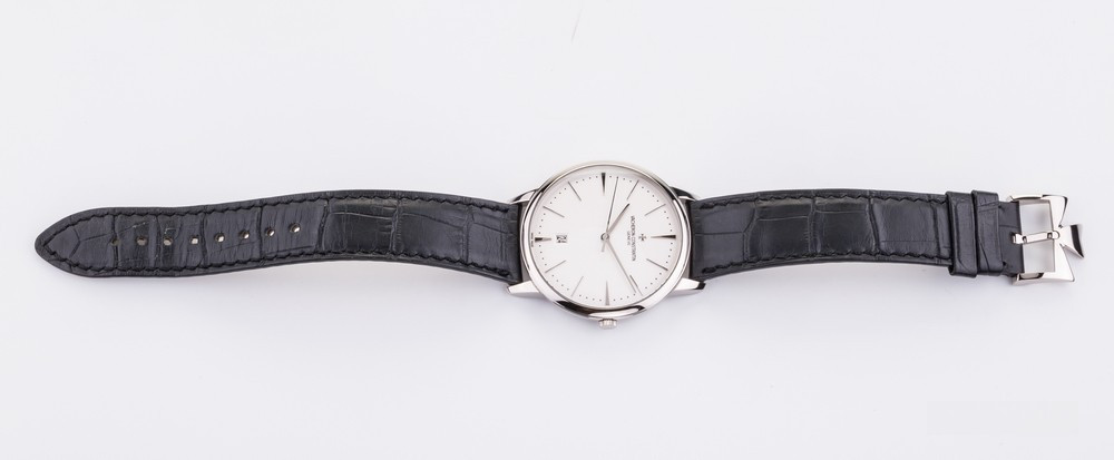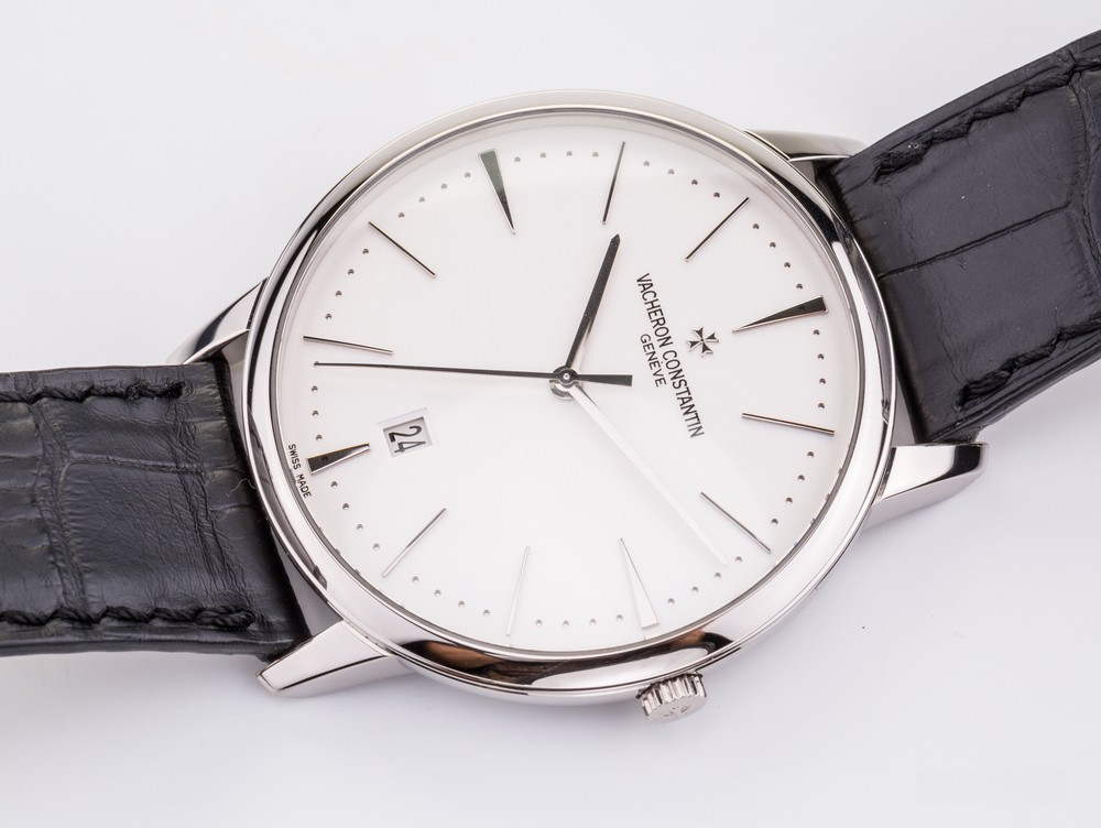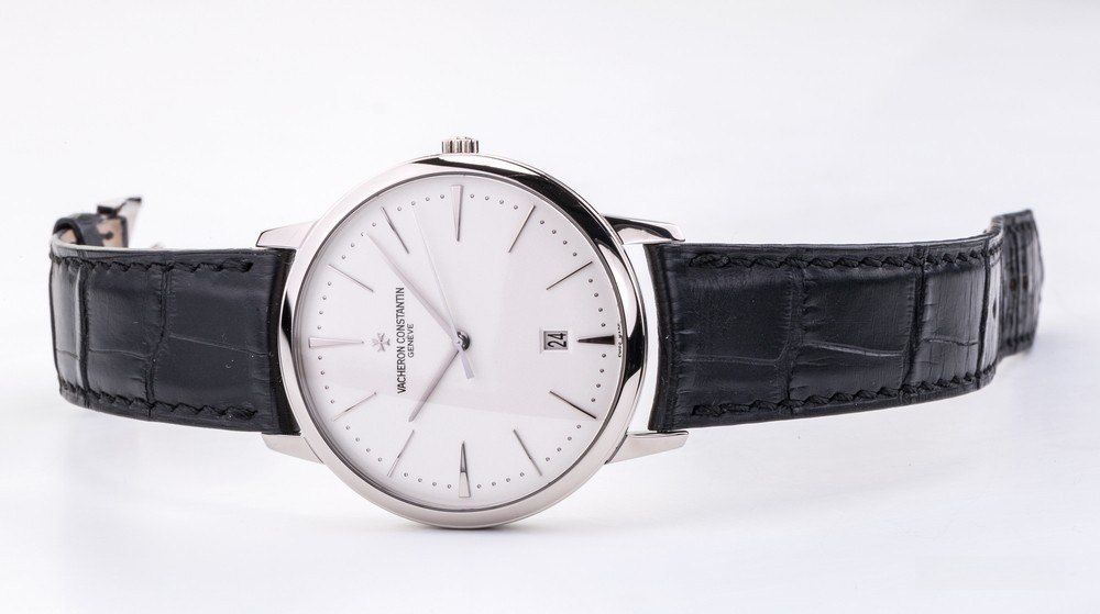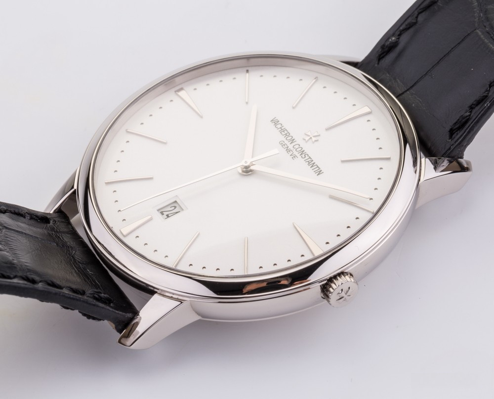 Мужские часы Vacheron Constantin Patrimony Contemporaine Date Self-Winding 85180/000G-9230 обладают ультратонким круглым корпусом из благородного белого золота 18 карат, размер составляет 40 х 9,3 мм. На белом циферблате апертура с датой размещена на позиции "6 часов". Часы водонепроницаемы до 30 метров, стекла – сапфировые. Часы снабжены автоматическим механизмом 450 SC, изготовленным компанией Vacheron Constantin. Запас хода составляет 40 часов. Модель дополнена ремешком из кожи аллигатора и снабжена фирменной застежкой в форме мальтийского креста из 18 каратного золота. Часы имеют Женевское клеймо – метку высшей пробы в часом деле.