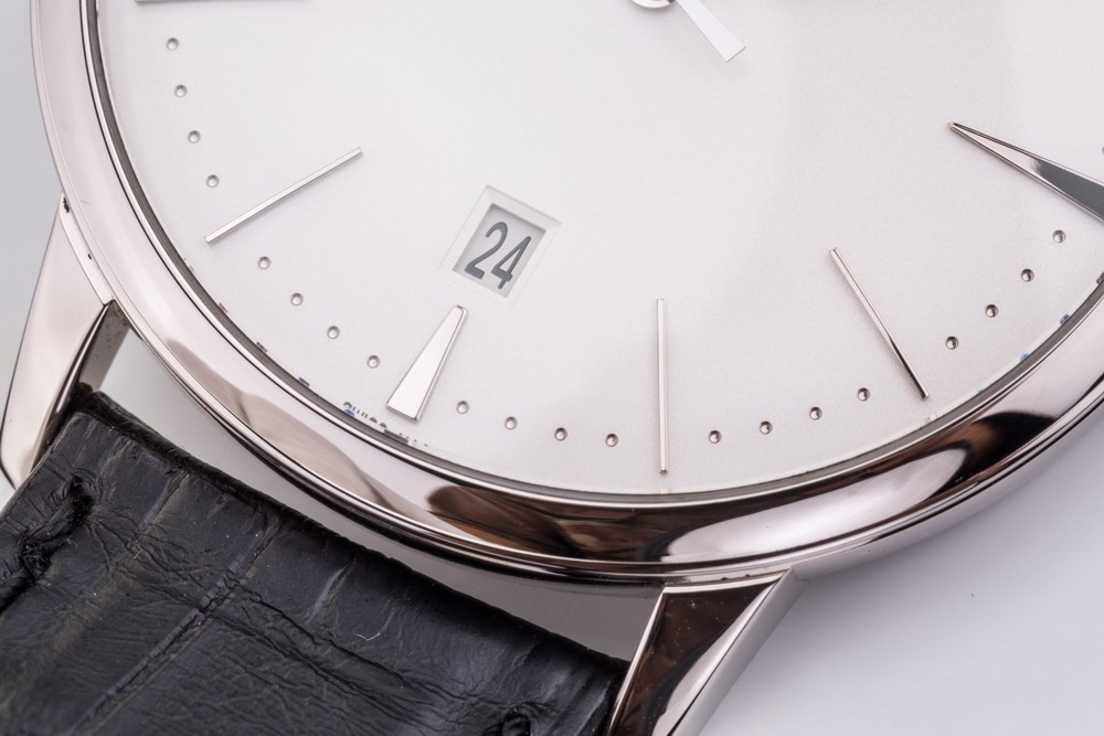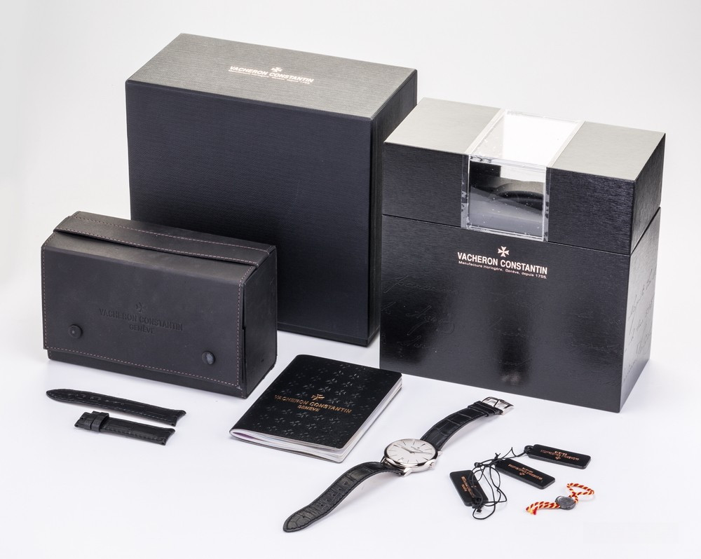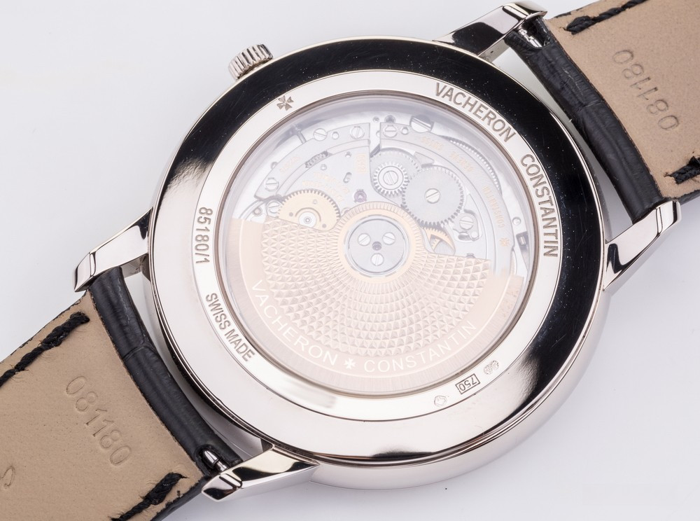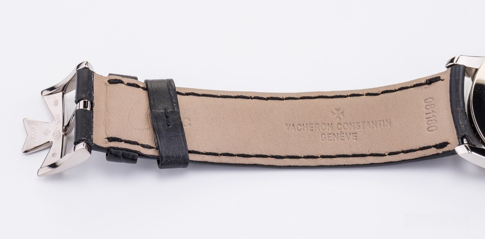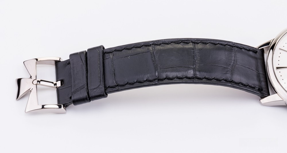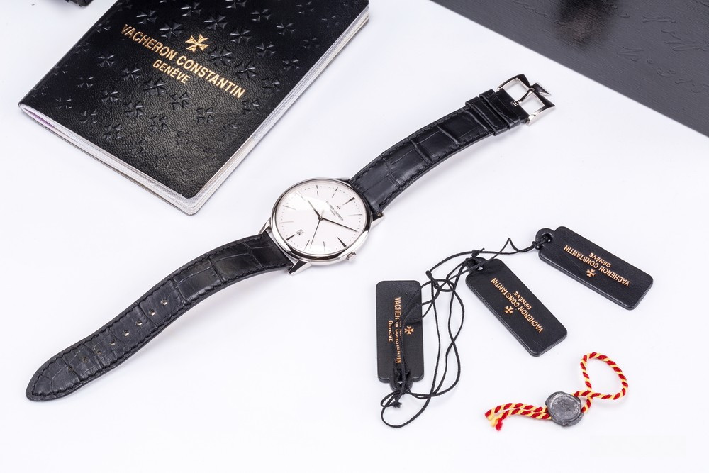 Мужские часы Vacheron Constantin Patrimony Contemporaine Date Self-Winding 85180/000G-9230 обладают ультратонким круглым корпусом из благородного белого золота 18 карат, размер составляет 40 х 9,3 мм. На белом циферблате апертура с датой размещена на позиции "6 часов". Часы водонепроницаемы до 30 метров, стекла – сапфировые. Часы снабжены автоматическим механизмом 450 SC, изготовленным компанией Vacheron Constantin. Запас хода составляет 40 часов. Модель дополнена ремешком из кожи аллигатора и снабжена фирменной застежкой в форме мальтийского креста из 18 каратного золота. Часы имеют Женевское клеймо – метку высшей пробы в часом деле.