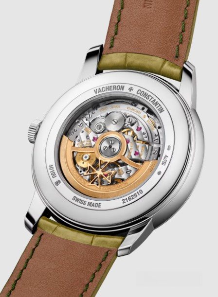 Часы с сертификатом Женевского клейма. Калибр 2460 R31L. Спроектирован и собран на мануфактуре Vacheron Constantin. Механизм с автоматическим подзаводом. Приблизительное время работы без подзавода – 40 часов. Индикация: часы, минуты, ретроградная индикация даты, точная индикация фаз Луны, указатель возраста Луны. Корпус белое золото 18 карат. Диаметр: 42,5 мм, толщина: 9,7 мм. Прозрачная задняя крышка из сапфирового стекла. Водонепроницаемость – 3 бар (около 30 метров). Циферблат посеребренный матовый. Выпуклая поверхность во внешней зоне. Часовые отметки с покрытием из белого золота 18 карат и минутная шкала в виде бусин из золота 18 карат, расположенная по окружности циферблата. Ремешок зеленый. Материал: кожа миссисипского аллигатора с крупным узором. Внутренняя отделка: кожа аллигатора. Прошит вручную седельным швом. Застежка белое золото 18 карат. Полированная, в виде половинки Мальтийского креста.